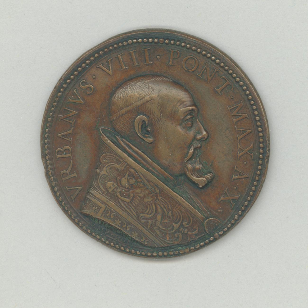 Pauspenning met portret paus Urbanus VIII (1623-1644), kz. baldakijn St. Pietersbasiliek door Bernini gebouwd