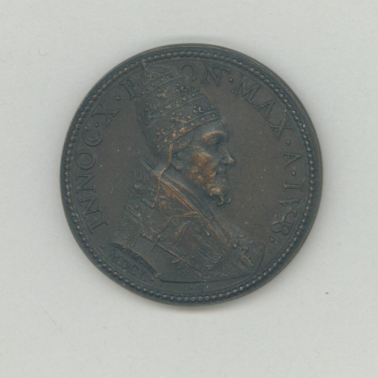 Pauspenning met portret paus Innocentius X (1644-1655), kz. paus hakt H. Deur open, prelaten rondom