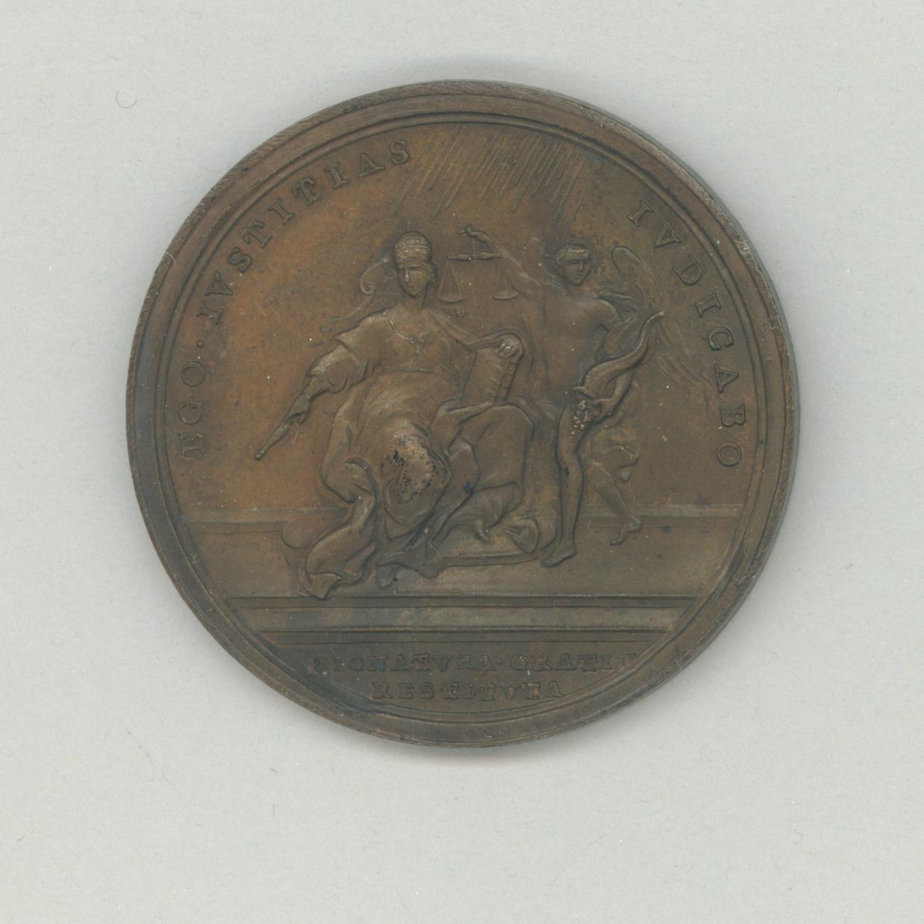 Pauspenning met portret paus Benedictus XIV (1740-1758), met "... AN XI", kz. vrouw tronend met scepter en codex, voorstellende de rechtvaardigheid, naast haar een genius met een weegschaal en hoorn des overvloeds