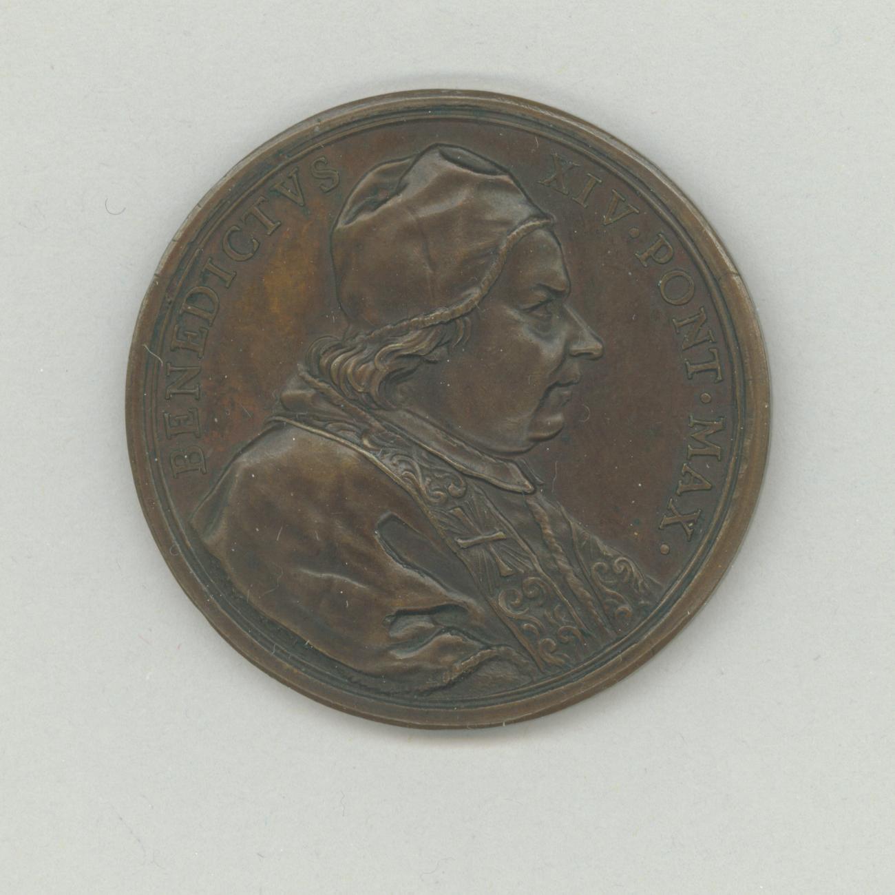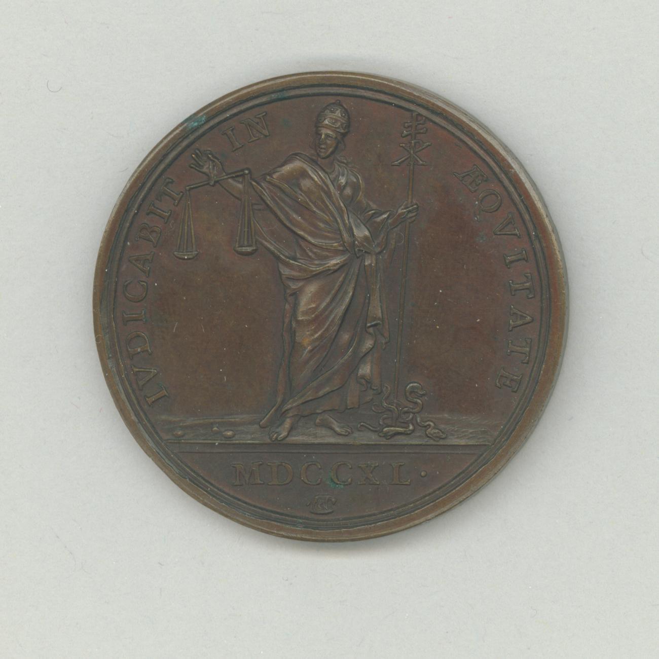 Pauspenning met portret paus Benedictus XIV (1740-1758), kz. personificatie met tiara met in rechterhand een weegschaal en in linkerhand een staf waarmee zij slangen teneer drukt