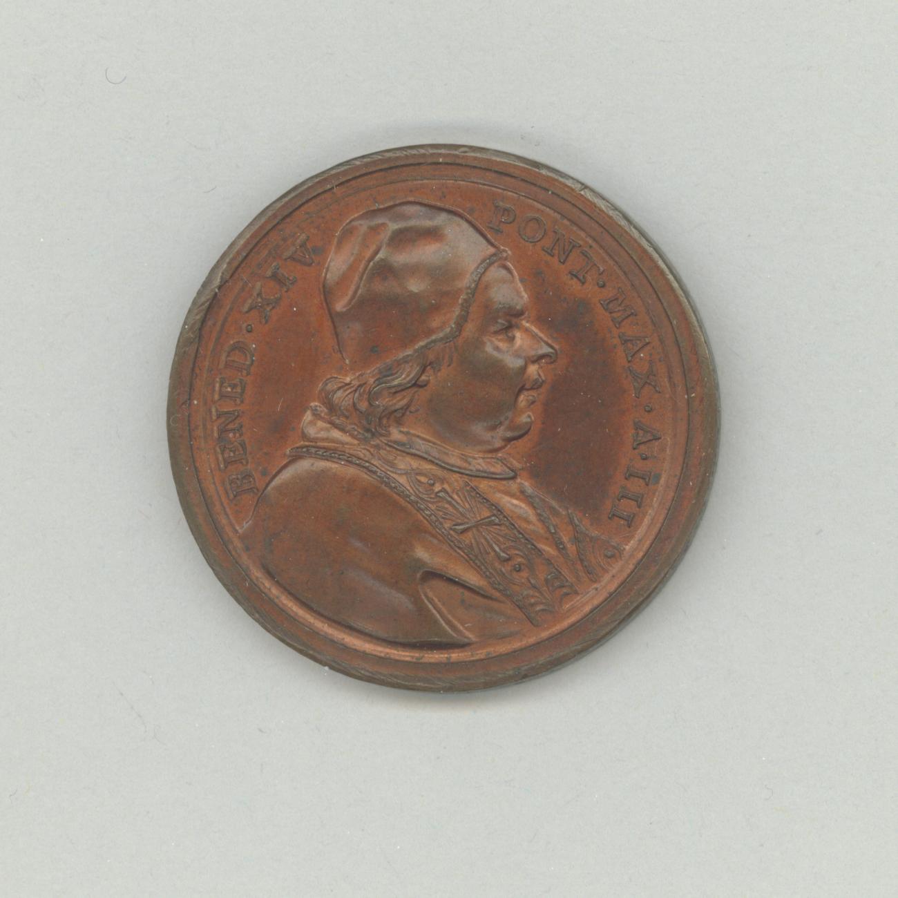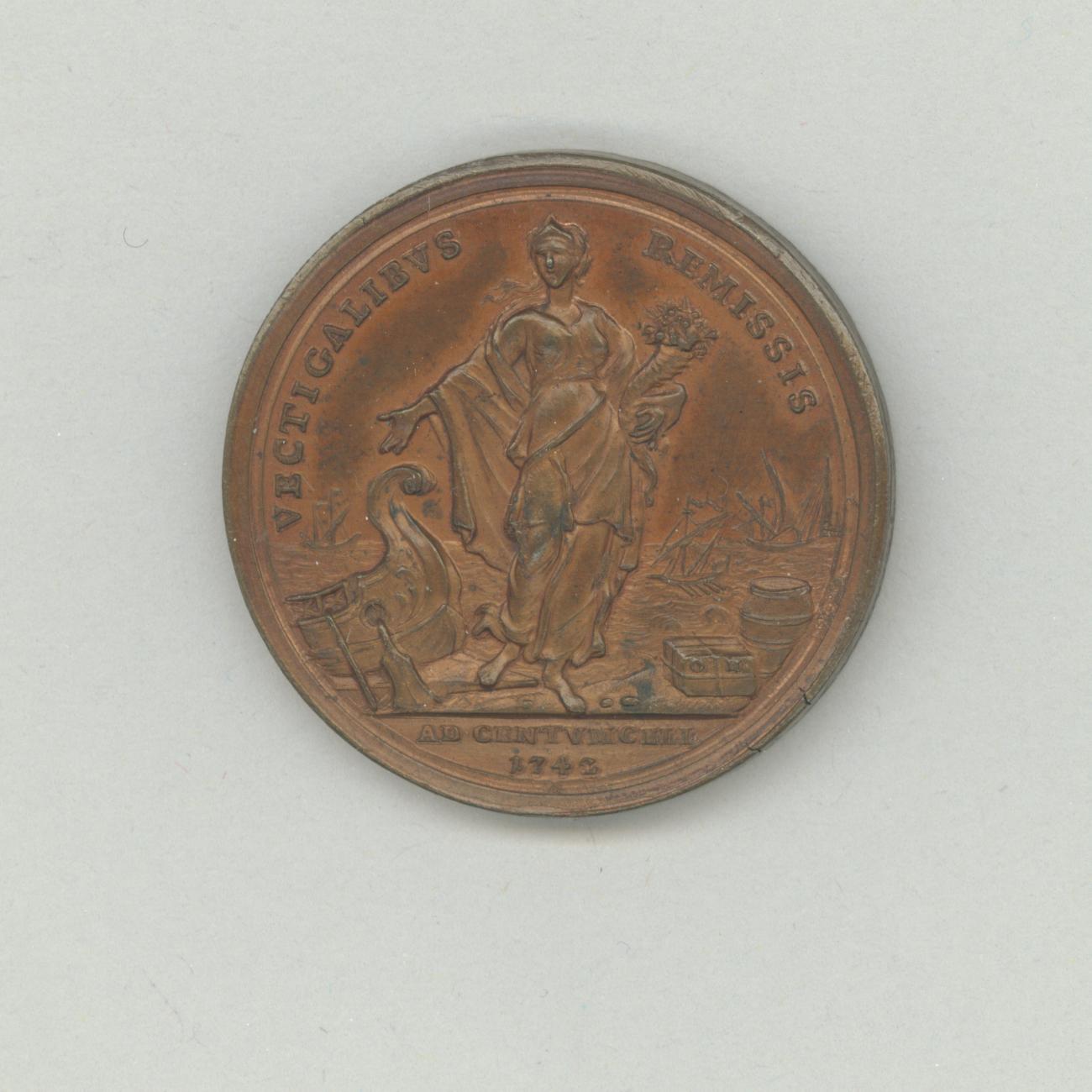 Pauspenning met portret paus Benedictus XIV (1740-1758) met met "... A III", kz. Abundantia met hoorn des overvloeds, haven Civita Vecchia