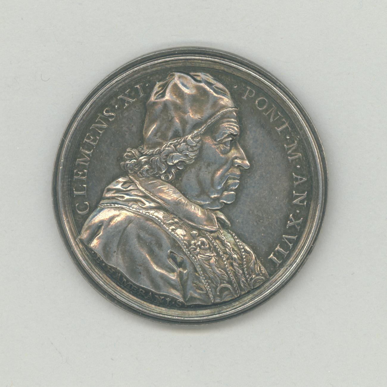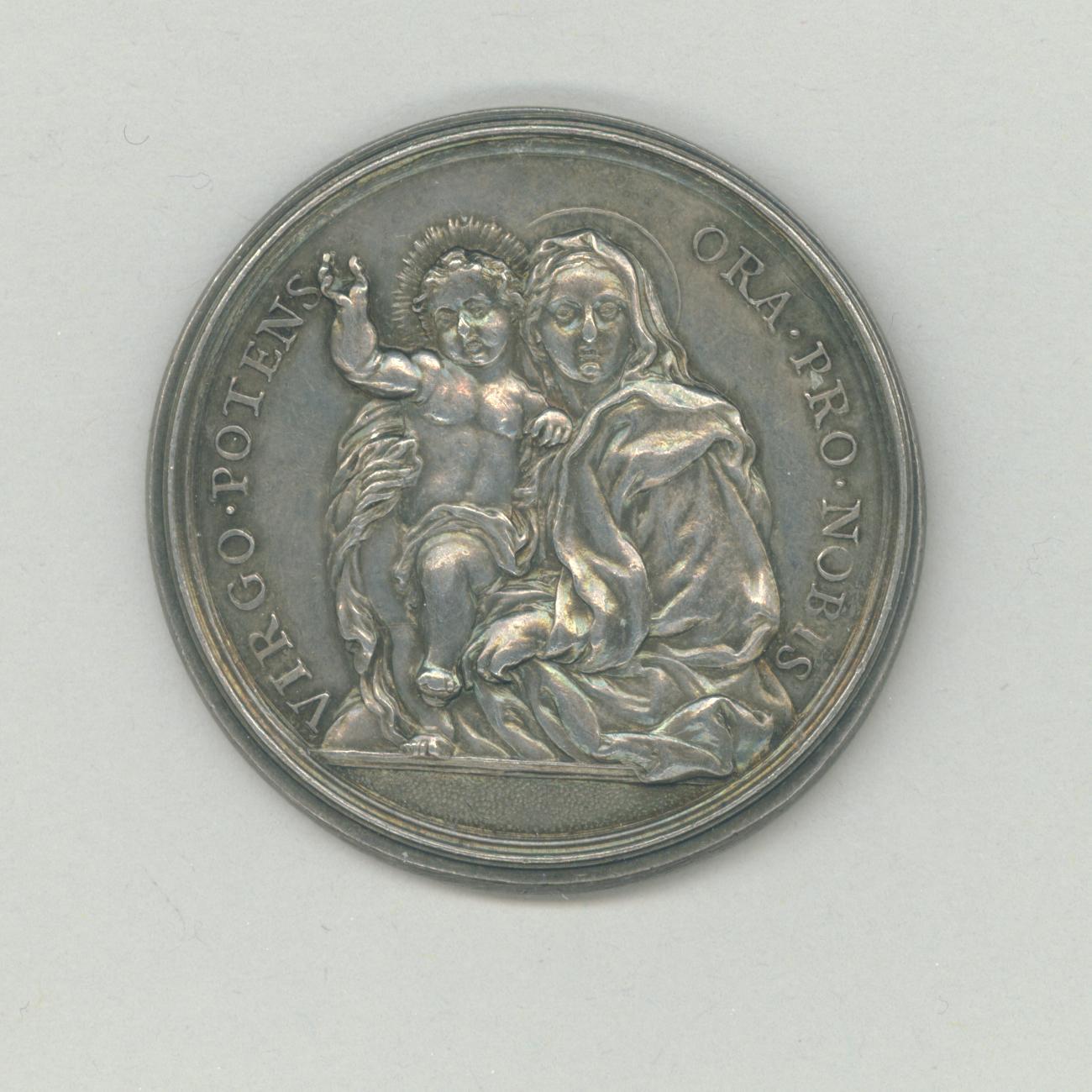Pauspenning met portret paus Clemens XI (1700-1721), met "... AN XVII", kz. Maria met kind