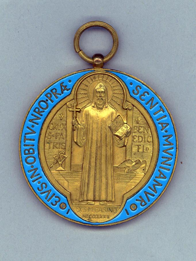 Benedictuspenning met H. Benedictus, kz. kruis met afkortingen
