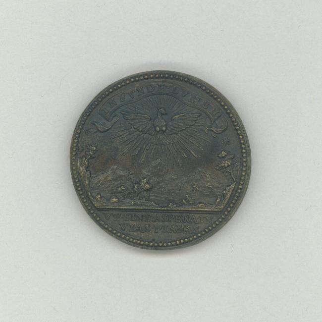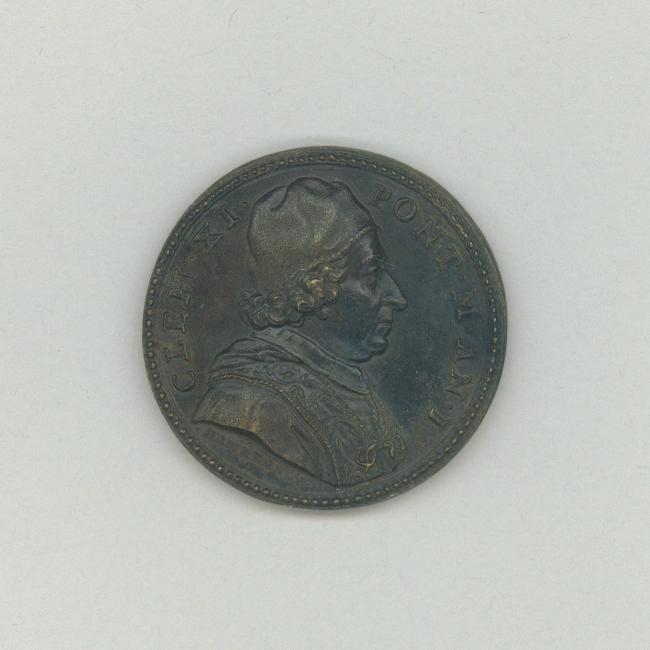 Pauspenning met portret paus Clemens XI (1700-1721) met "... AN I", kz. landschap en H. geest