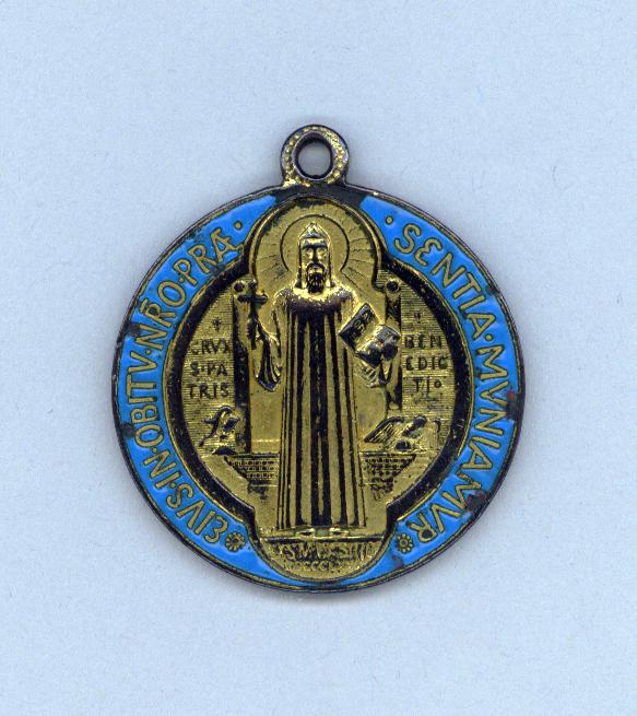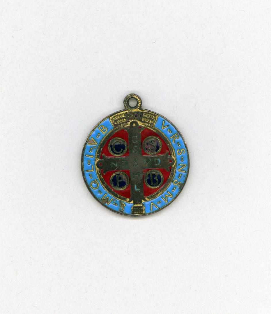 Benedictuspenning met H. Benedictus, kz. kruis met afkortingen