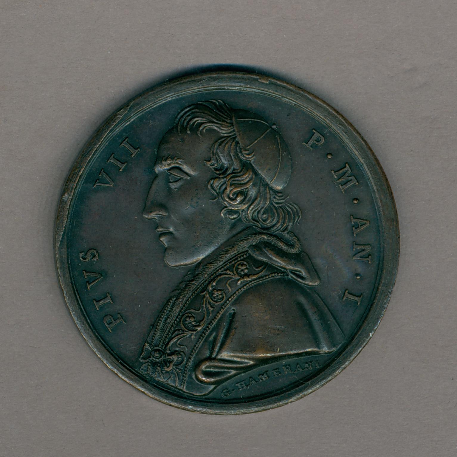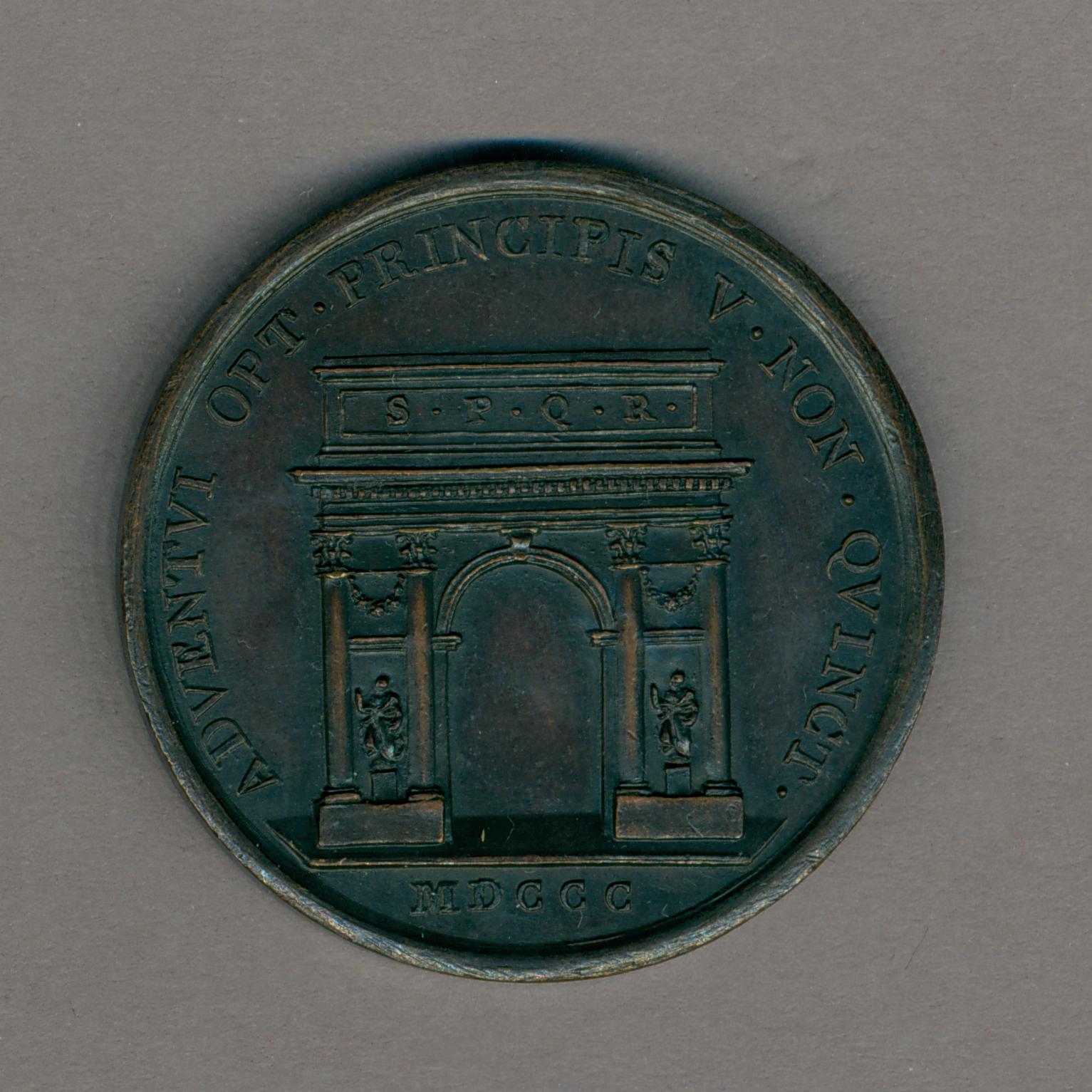 Pauspenning met portret paus Pius VII (1800-1823) met "... AN I", kz. triomfboog
