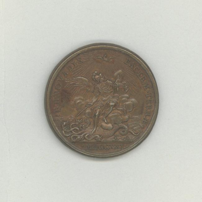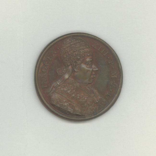 Pauspenning met portret paus Innocentius XIII (1721-1724) met "... A I", kz. St. Michaël verslaat draak