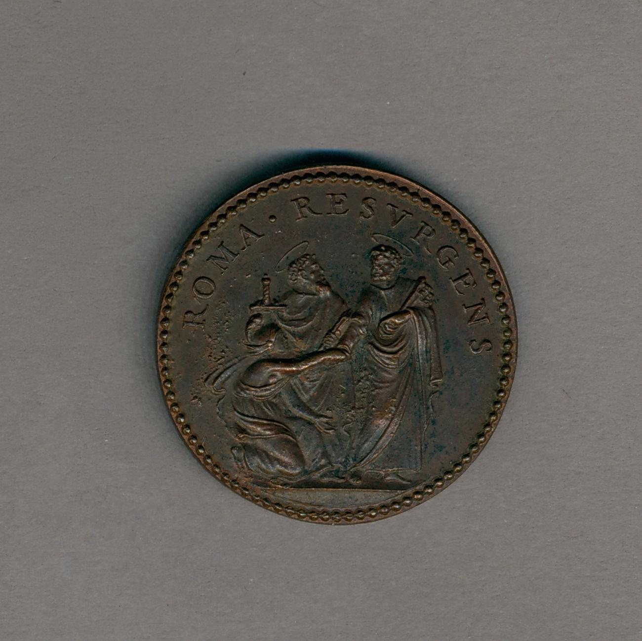 Pauspenning met portret paus Clemens X (1670-1676), kz. Petrus en Paulus reiken de hand aan knielende vrouw, personificatie van Rome