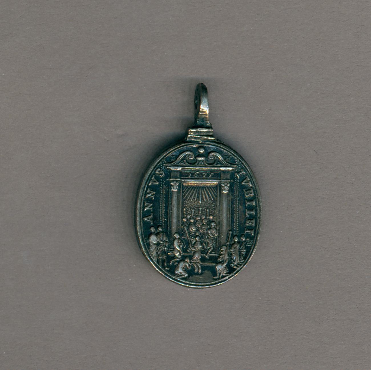 Hanger, ovaal, paus Clemens X (1670-1676) met portret Maria, kz. processie trekt door H. Deur