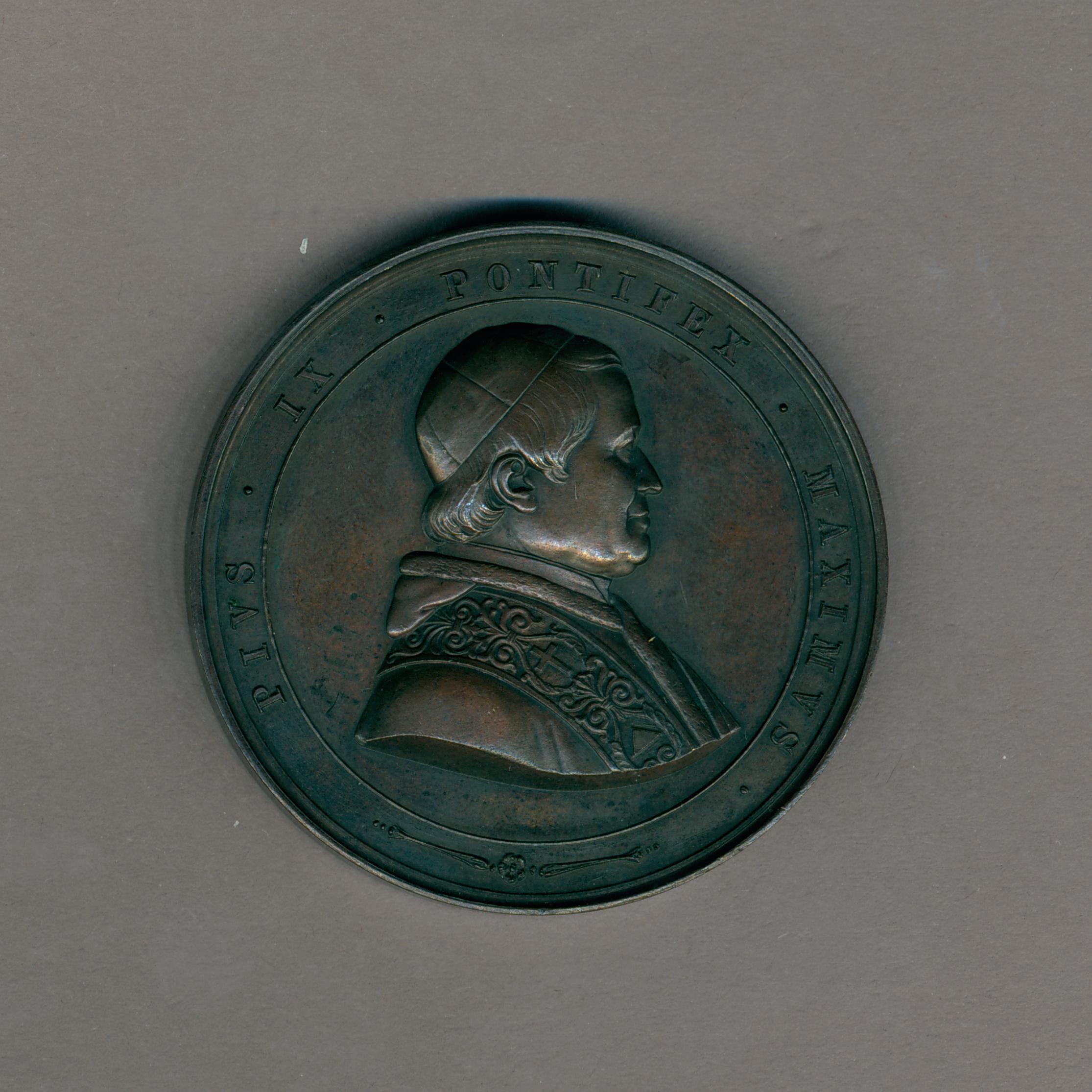 Pauspenning met portret paus Pius IX (1846-1878), kz. St. Paulus basiliek na verwoesting door brand