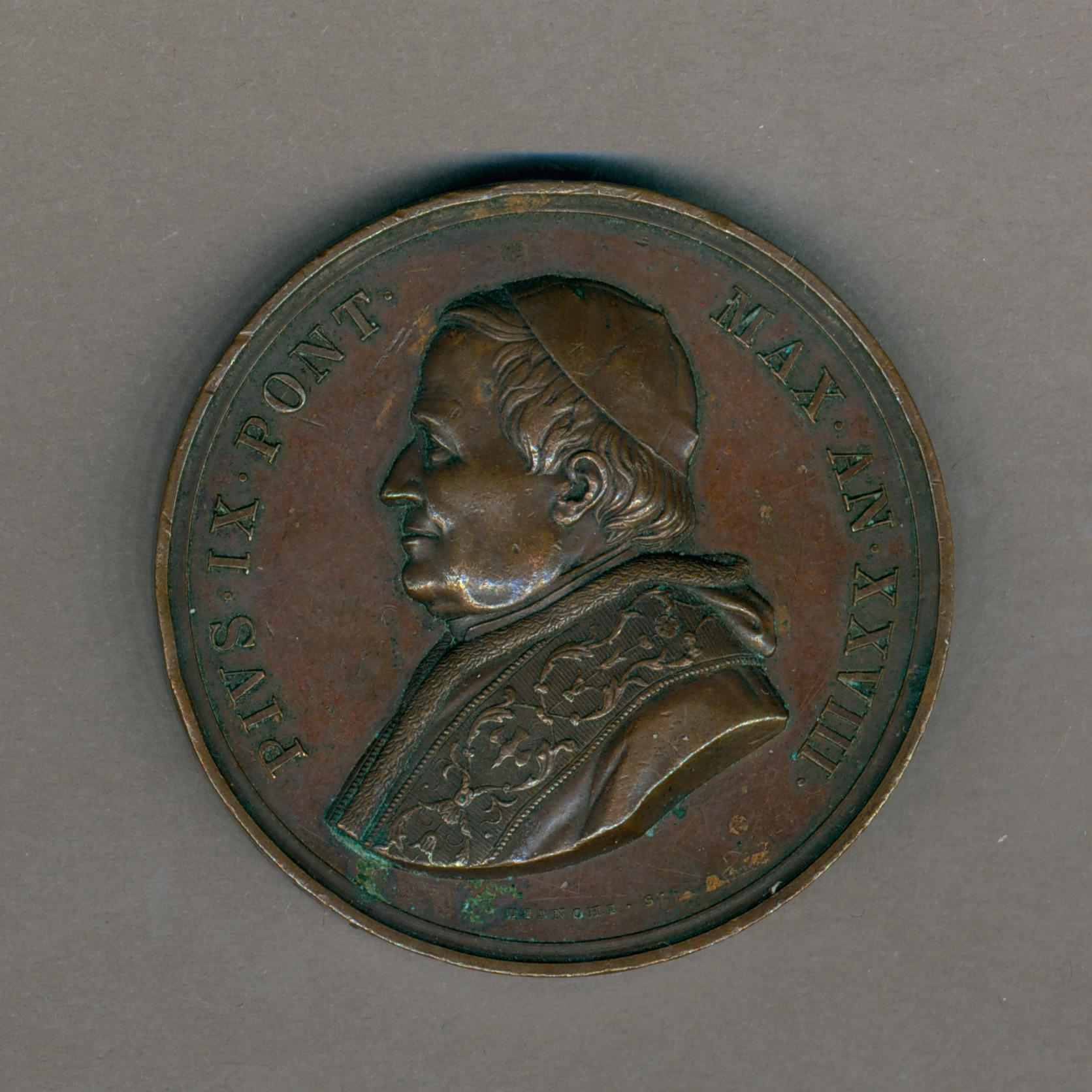 Pauspenning met portret paus Pius IX (1846-1878), met "... AN XXVIII", kz. interieur basiliek H. Laurentius