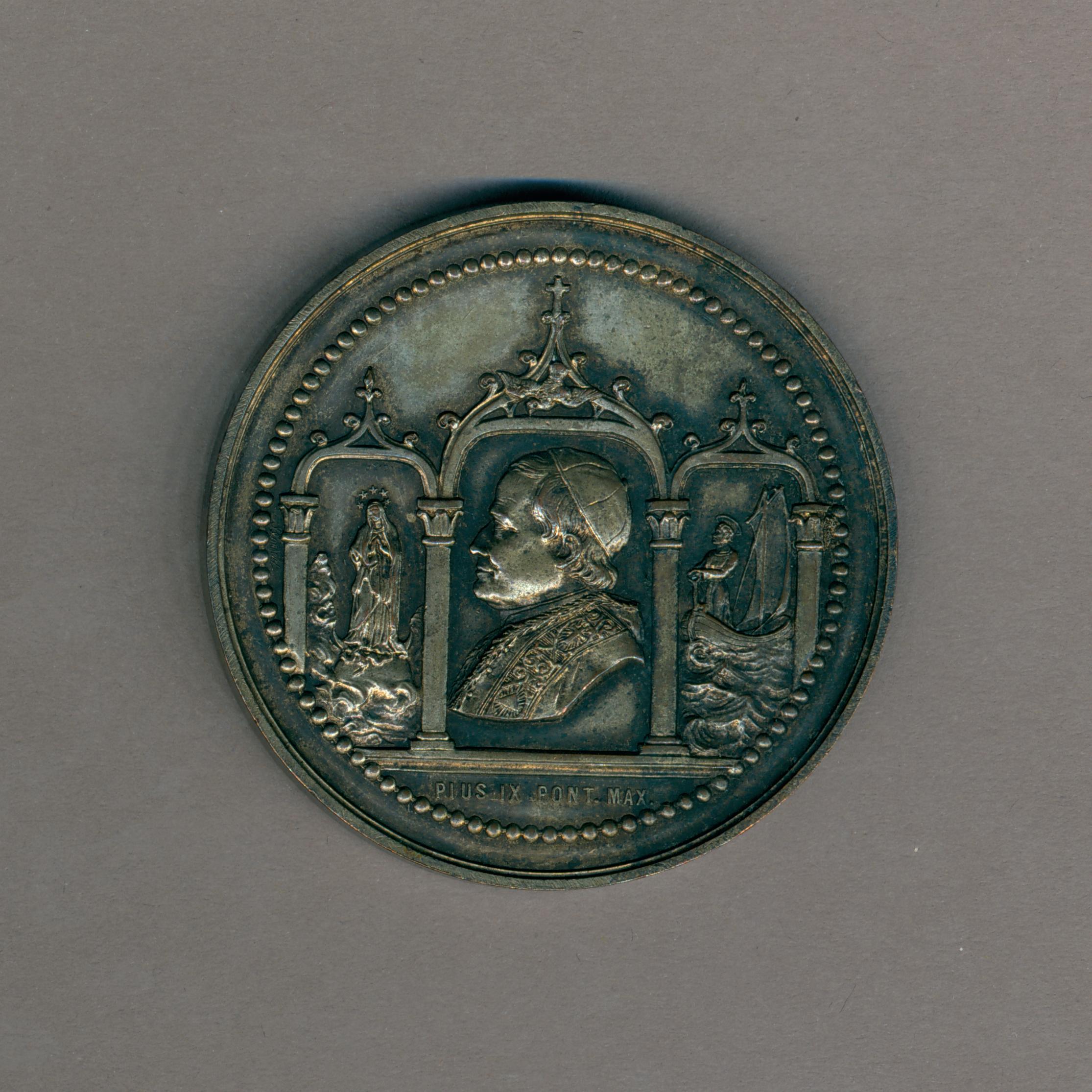 Pauspenning met portret paus Pius IX (1846-1878) middenin drieluik, links Maria op wolk, rechts Petrus in schip, kz. oecumenisch concilie