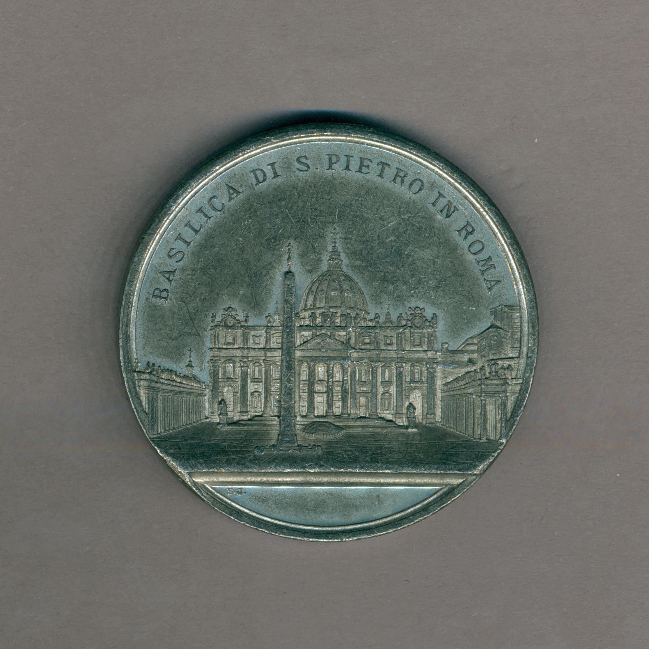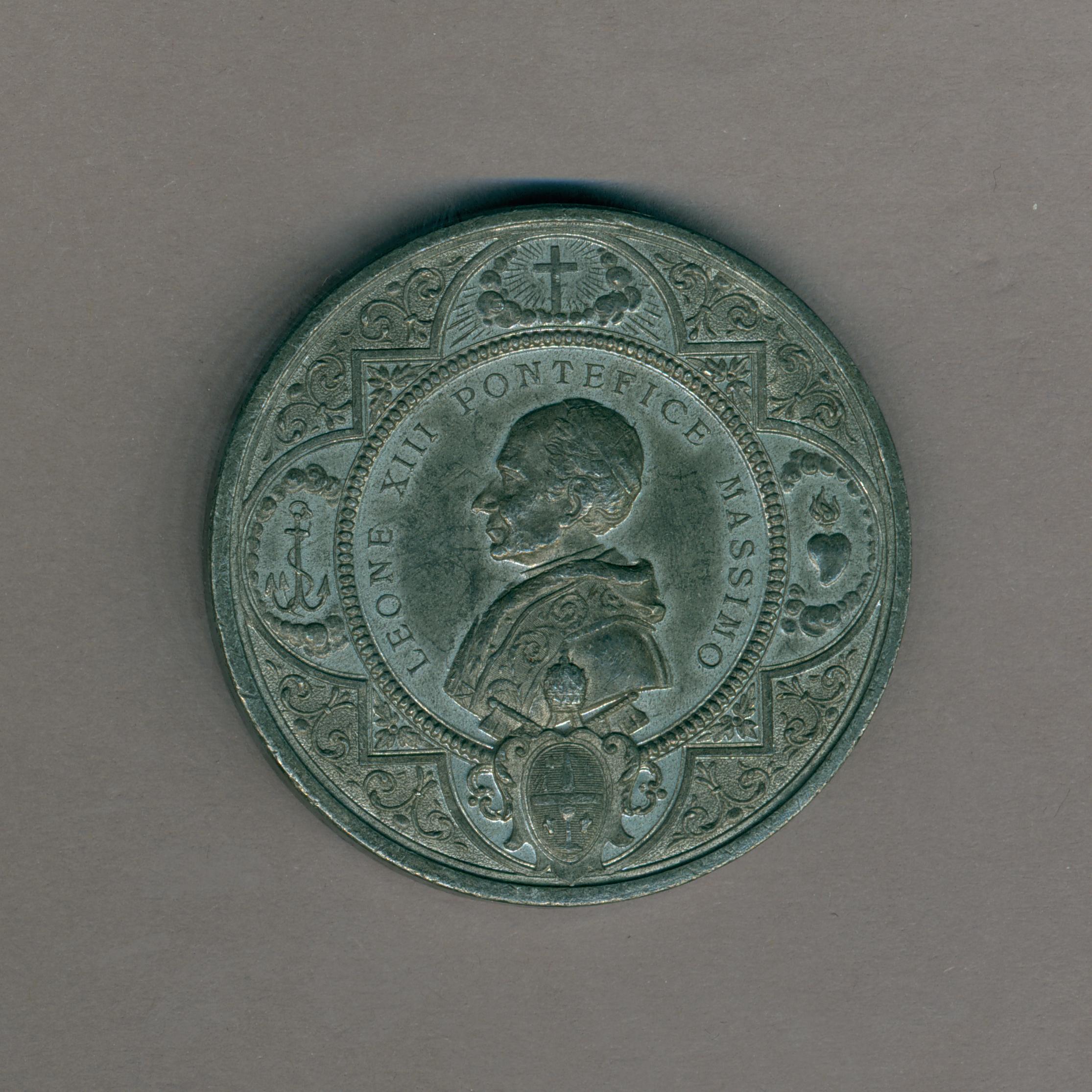 Pauspenning met portret paus Leo XIII (1878-1903) omringd door symbolen geloof, hoop en liefde en het pauselijk wapen, kz. basiliek St. Pieter