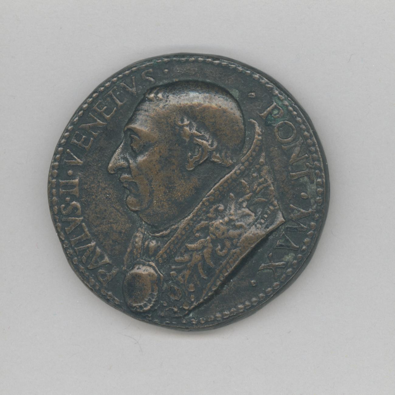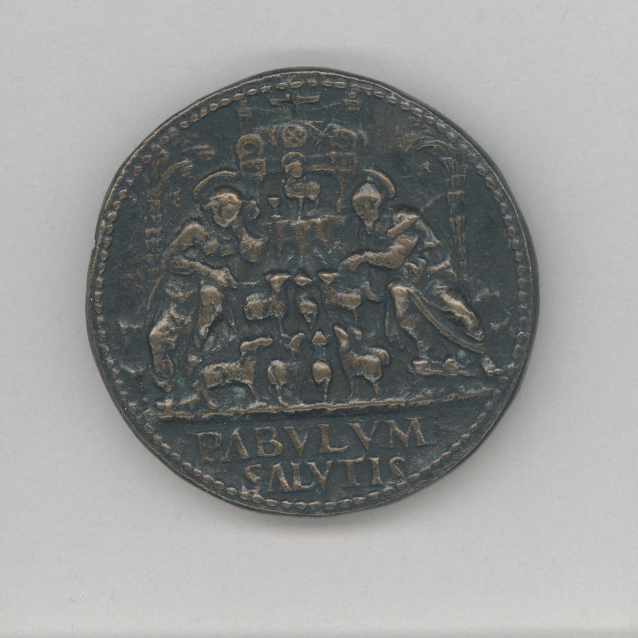 Pauspenning met portret paus Paulus II (1464-1471), kz. met 'Pabulum Salutis' en schapen die gevoerd worden door heiligen(?)