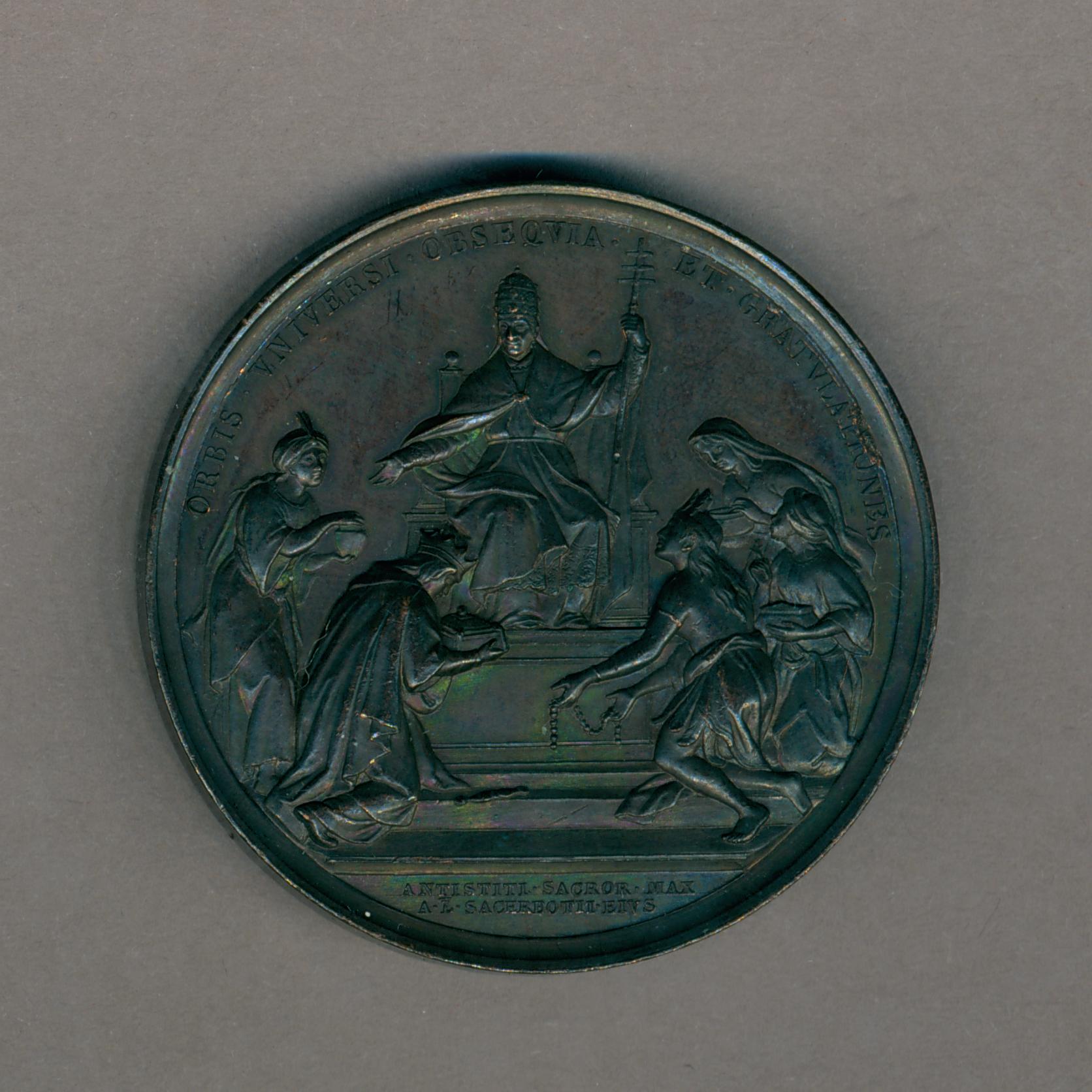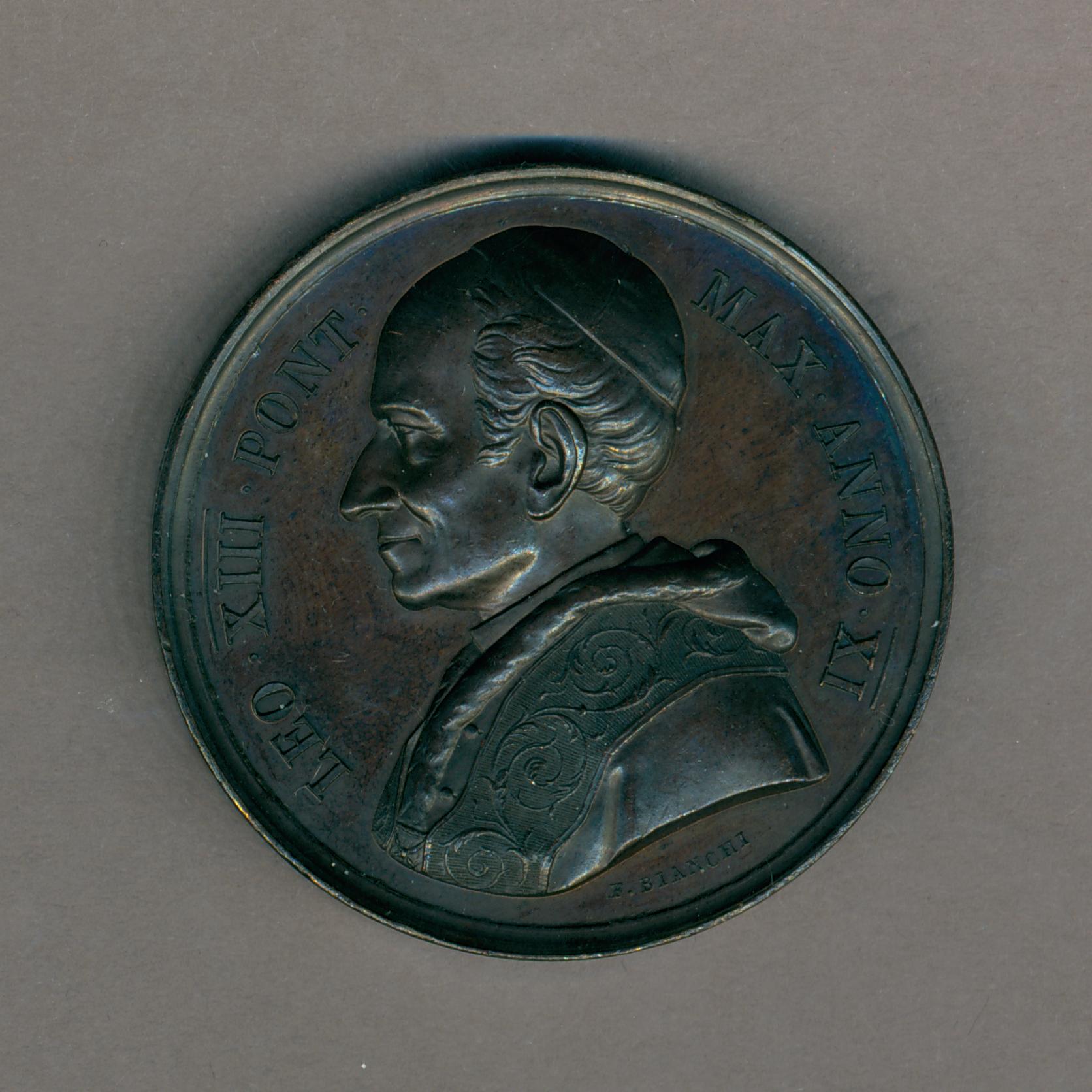 Pauspenning met portret paus Leo XIII (1878-1903), met "... ANNO XI", kz. paus, zittend op troon, ontvangt eerbewijzen en geschenken ter gelegenheid van zijn vijftigjarig priesterschap