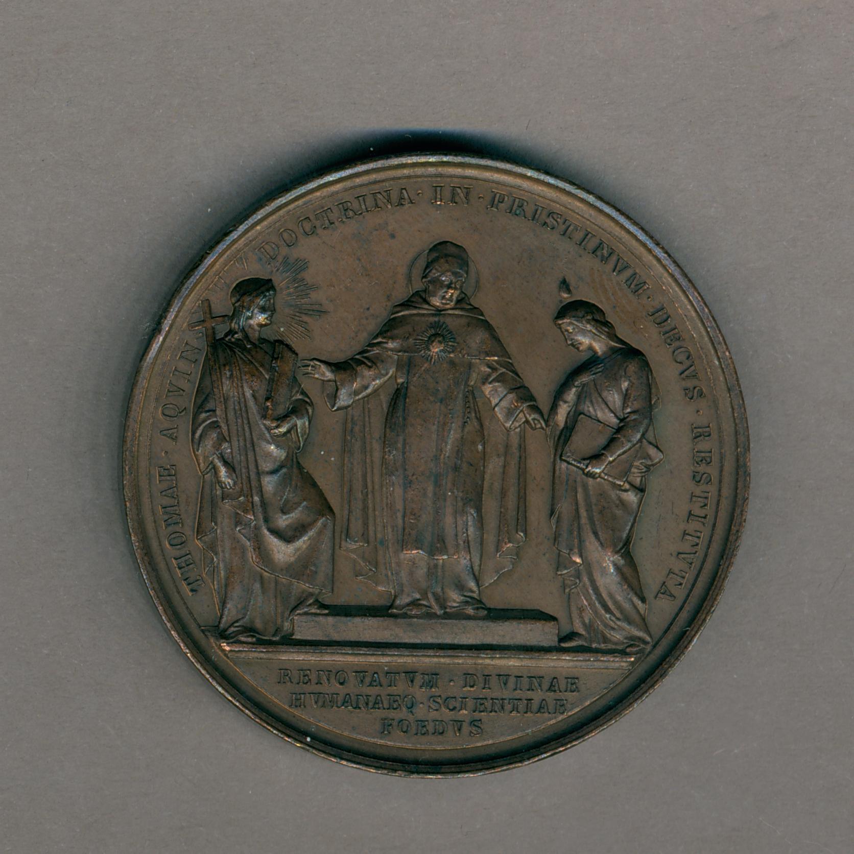 Pauspenning met portret paus Leo XIII (1878-1903), met "... ANNO III", kz. Thomas van Aquino en twee allegorische vrouwfiguren, rechts goddelijke kennis, links menselijke kennis