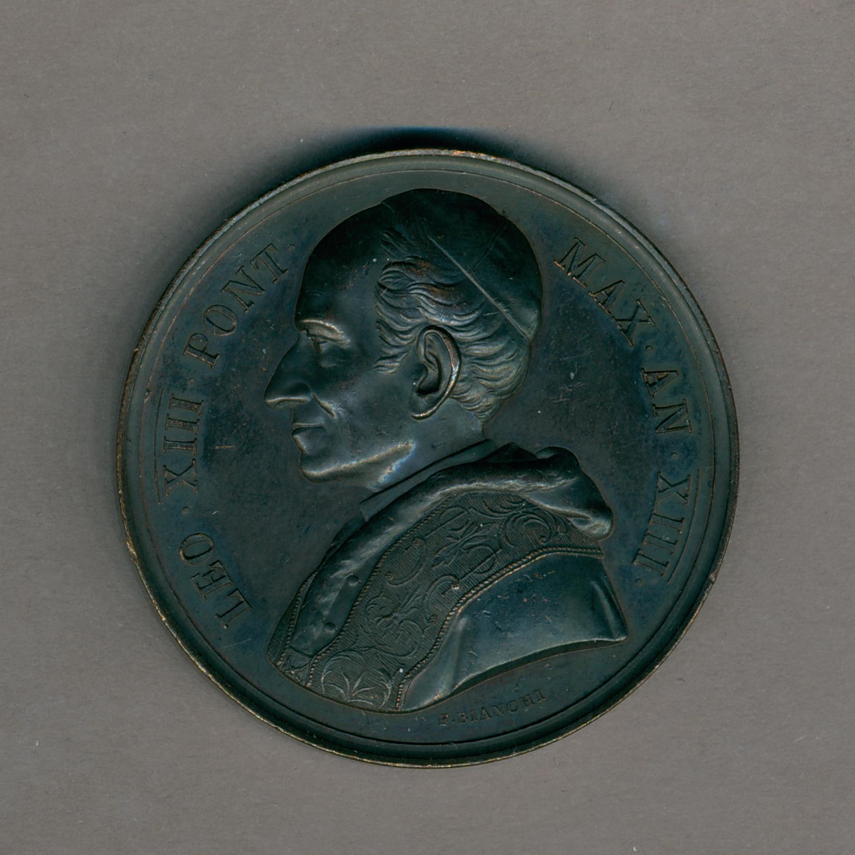 Pauspenning met portret paus Leo XIII (1878-1903), kz. Petrus zittend op rots, handen en voeten geboeid, sleutel in zijn rechterhand
