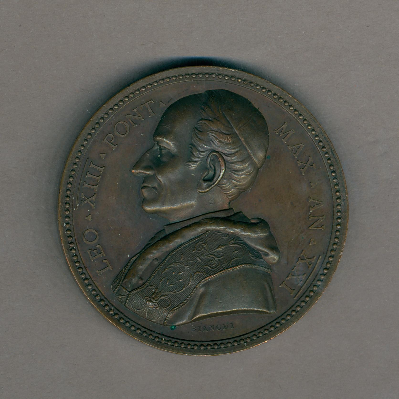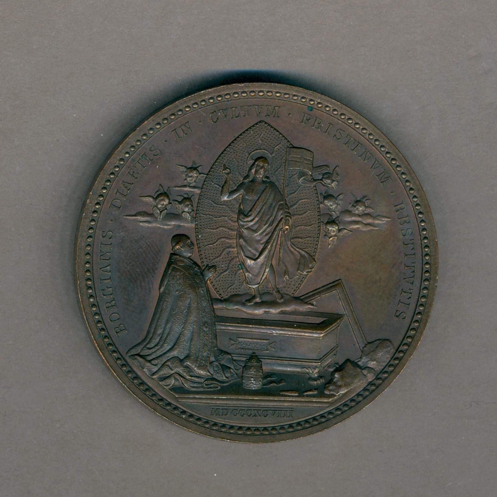 Pauspenning met portret paus Leo XIII (1878-1903) , kz. wederopstanding, paus Alexander VI knielt voor graf, cherubijnen