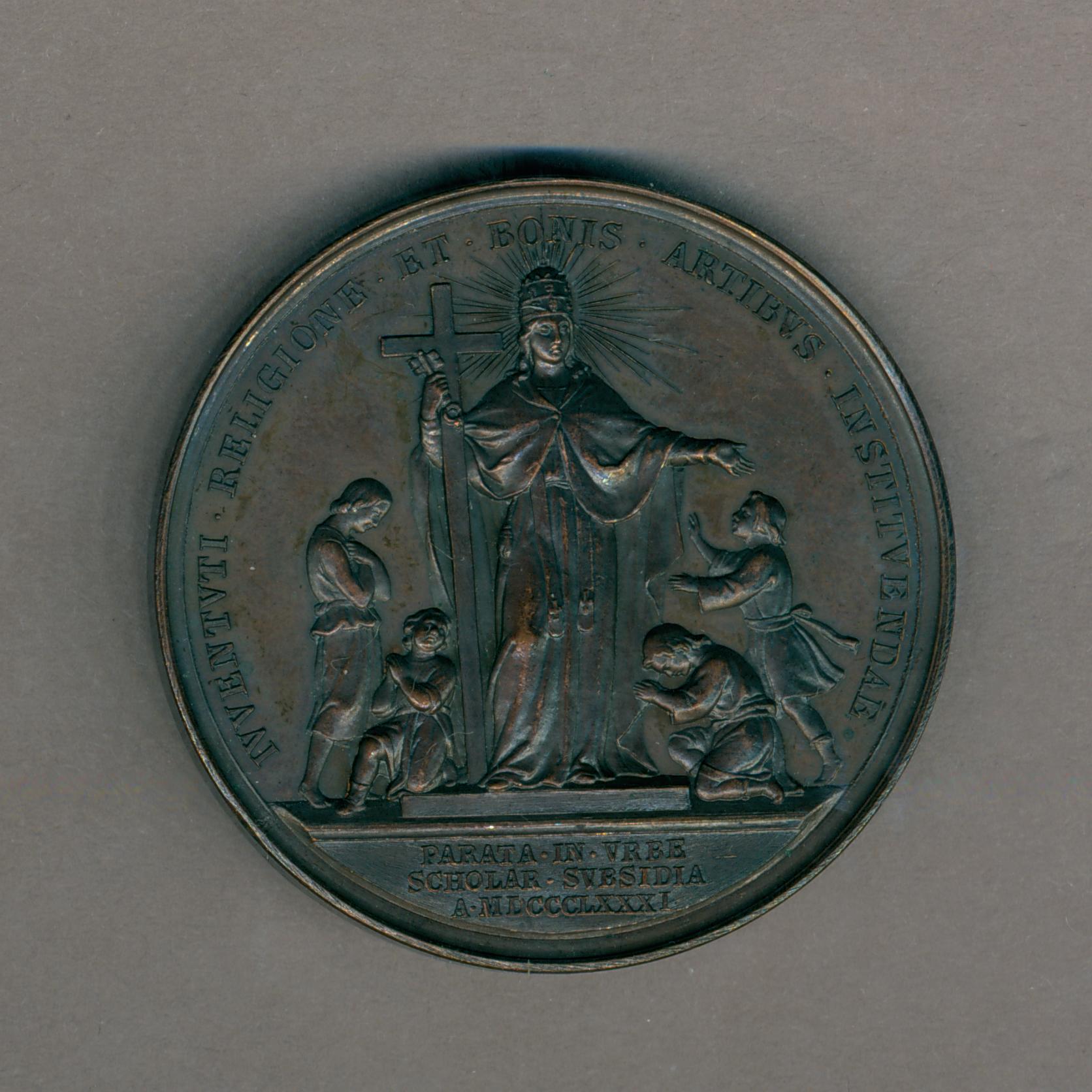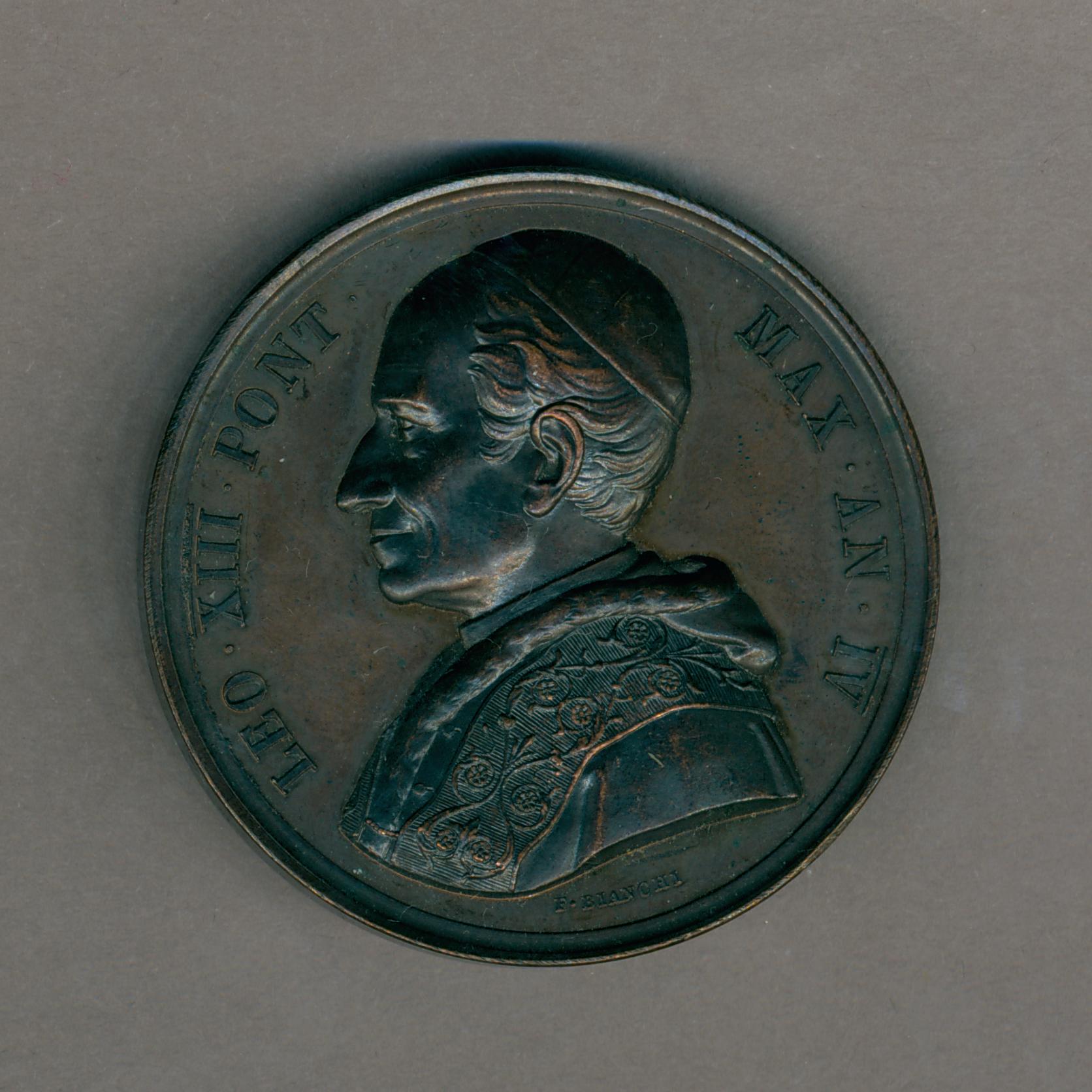 Pauspenning met portret paus Leo XIII (1878-1903), kz. personificatie van de kerk, kruis en sleutel in haar rechterhand, vier kinderen rondom
