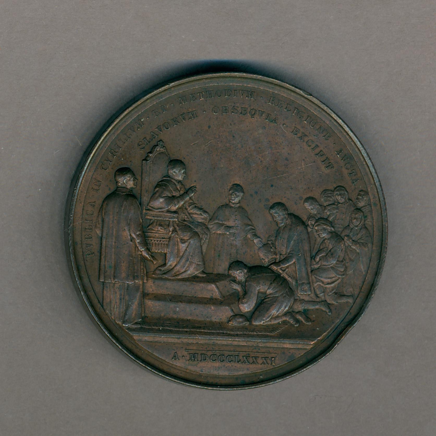 Pauspenning met portret paus Leo XIII (1878-1903), kz. paus op troon, groep Slavische pelgrims brengt hommage aan de paus