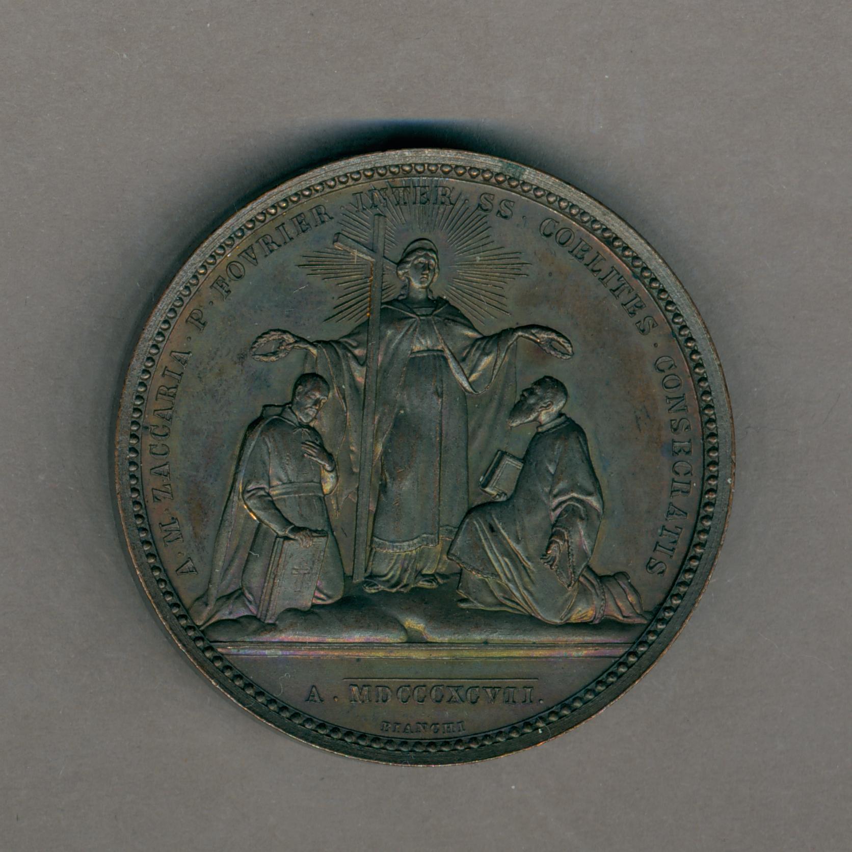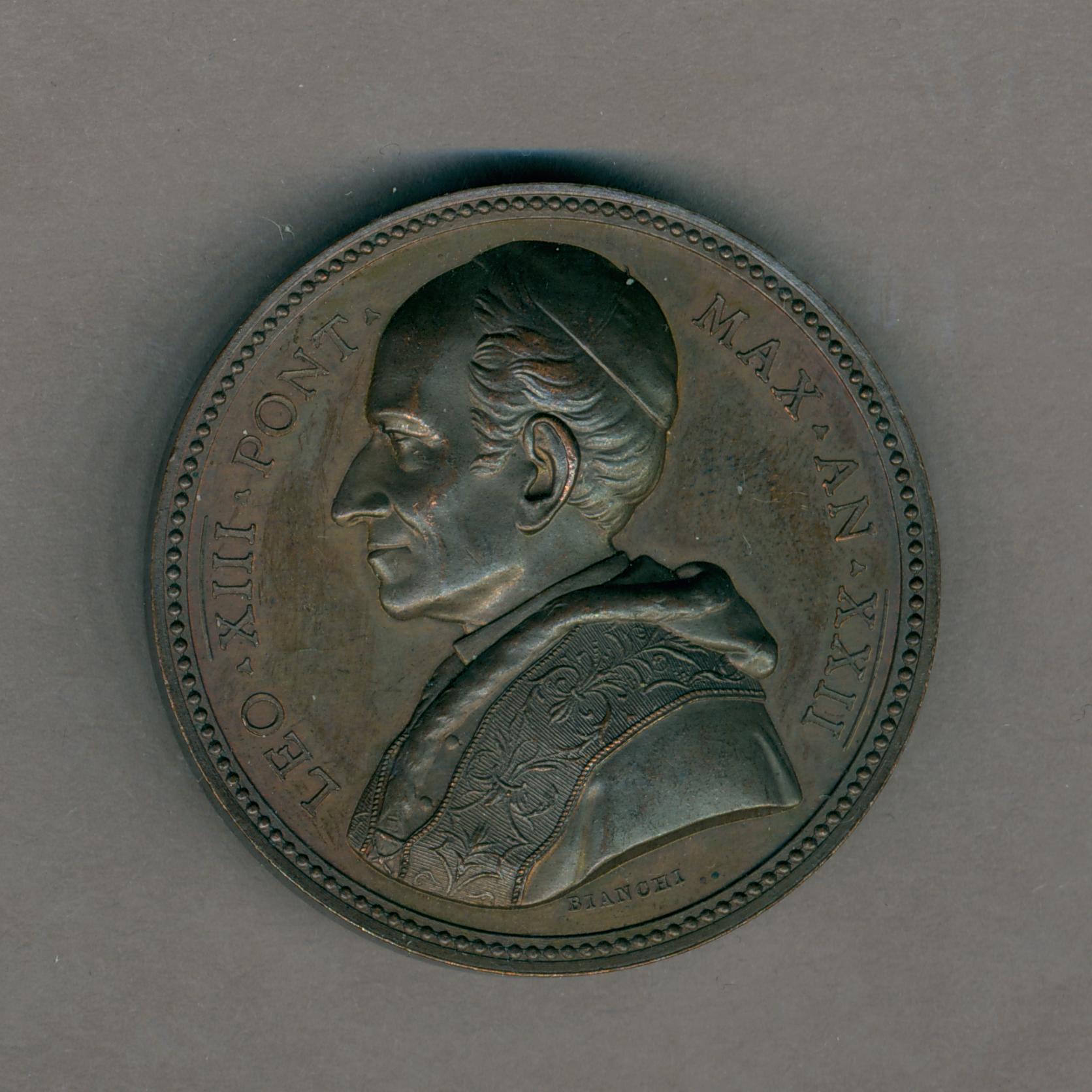 Pauspenning met portret paus Leo XIII (1878-1903), met "... AN XXII", kz. personificatie van de kerk, kerk zegent Zaccaria en Fauvrier t.g.v. heiligverklaring