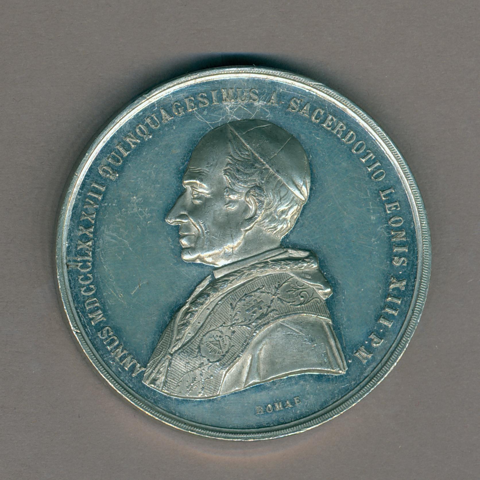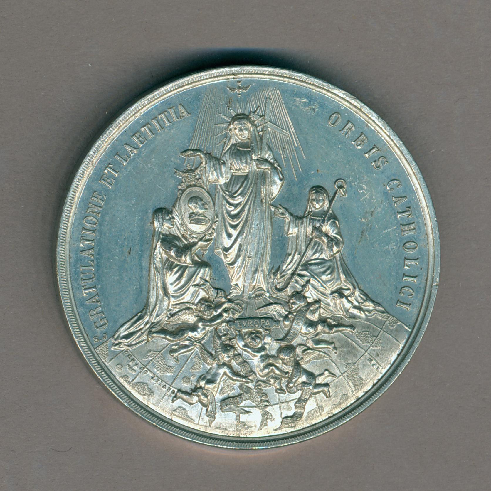 Pauspenning met portret paus Leo XIII (1878-1903), kz. personificatie van de kerk op wereldbol, rechts van haar een knielende vrouw met een beeltenis van de paus, tiara en sleutels, links van haar een knielende vrouw met een anker, engelen op wereldbol houden namen van continenten vast