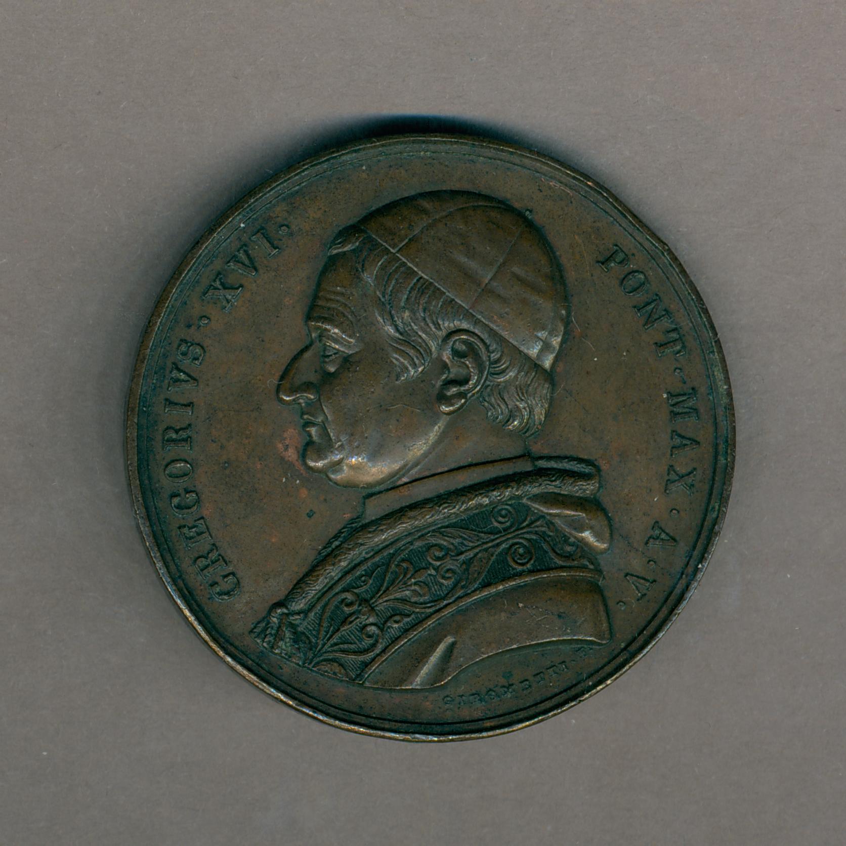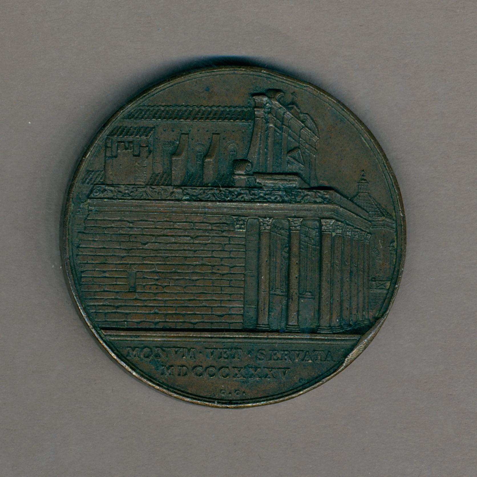 Pauspenning met portret paus Gregorius XVI (1831-1846), kz. tempel van Antonius en Faustinus, kerk van H. Lorenzo in Miranda steekt hierboven uit