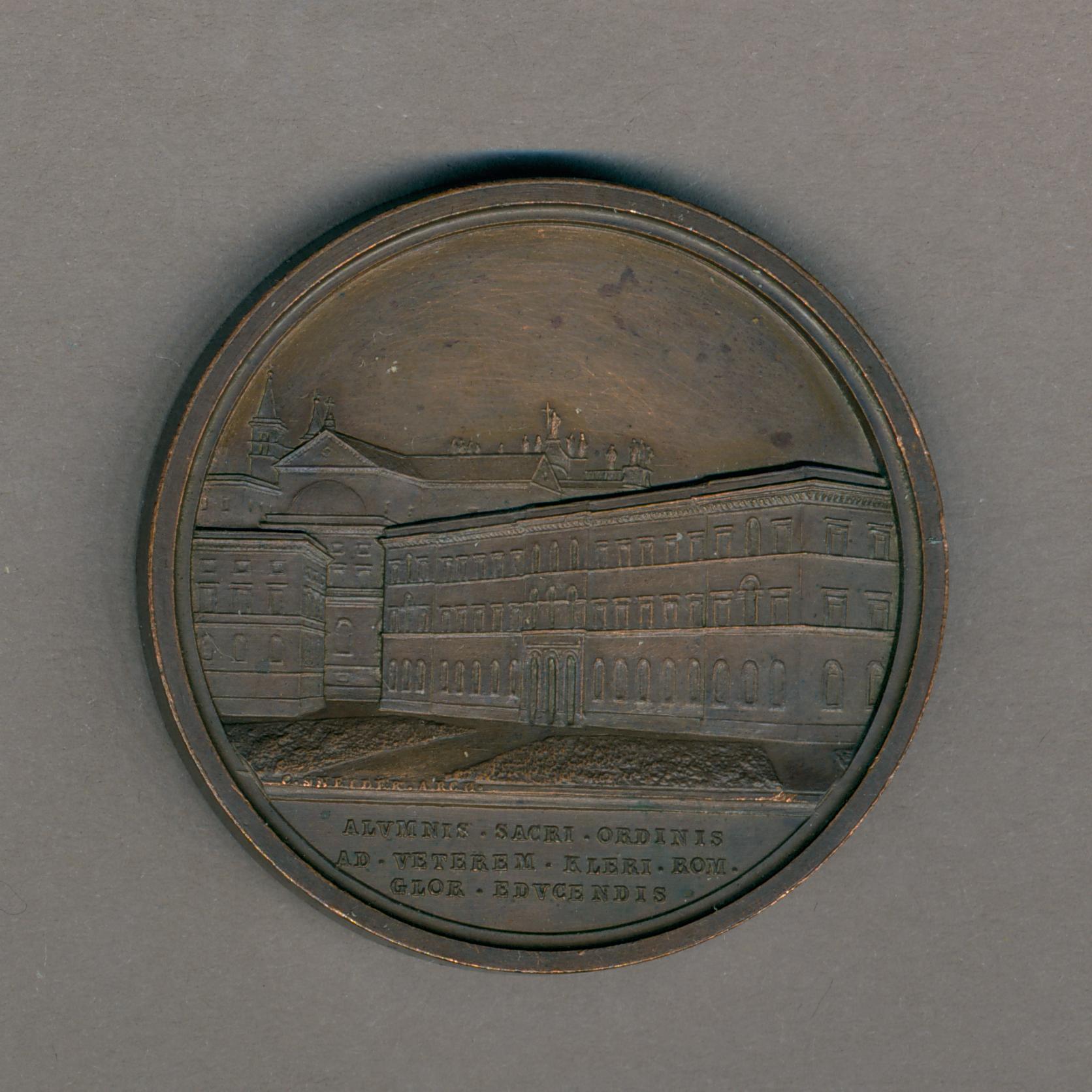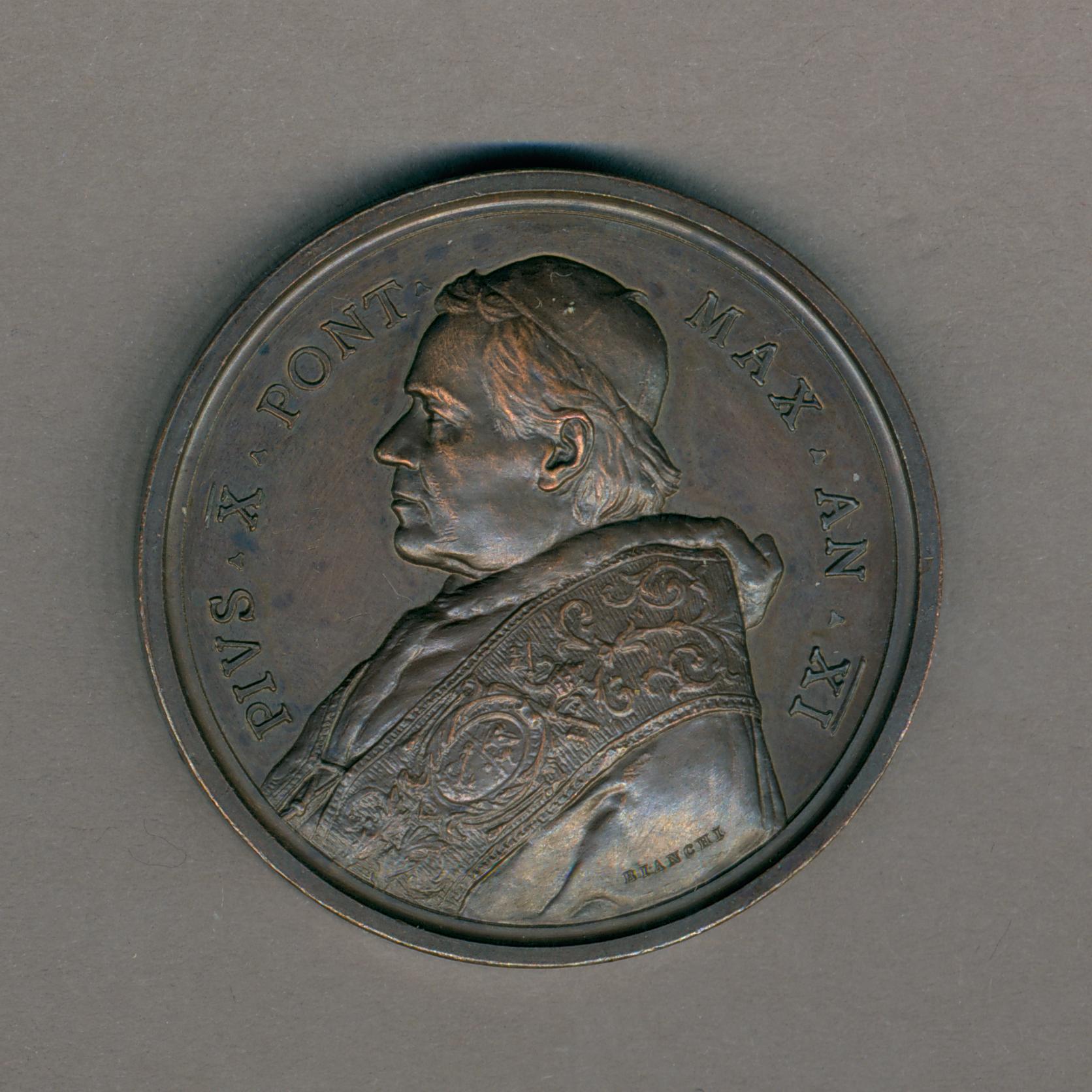 Pauspenning met portret paus Pius X (1903-1914), met "... AN XI", kz. college met erachter een kerk