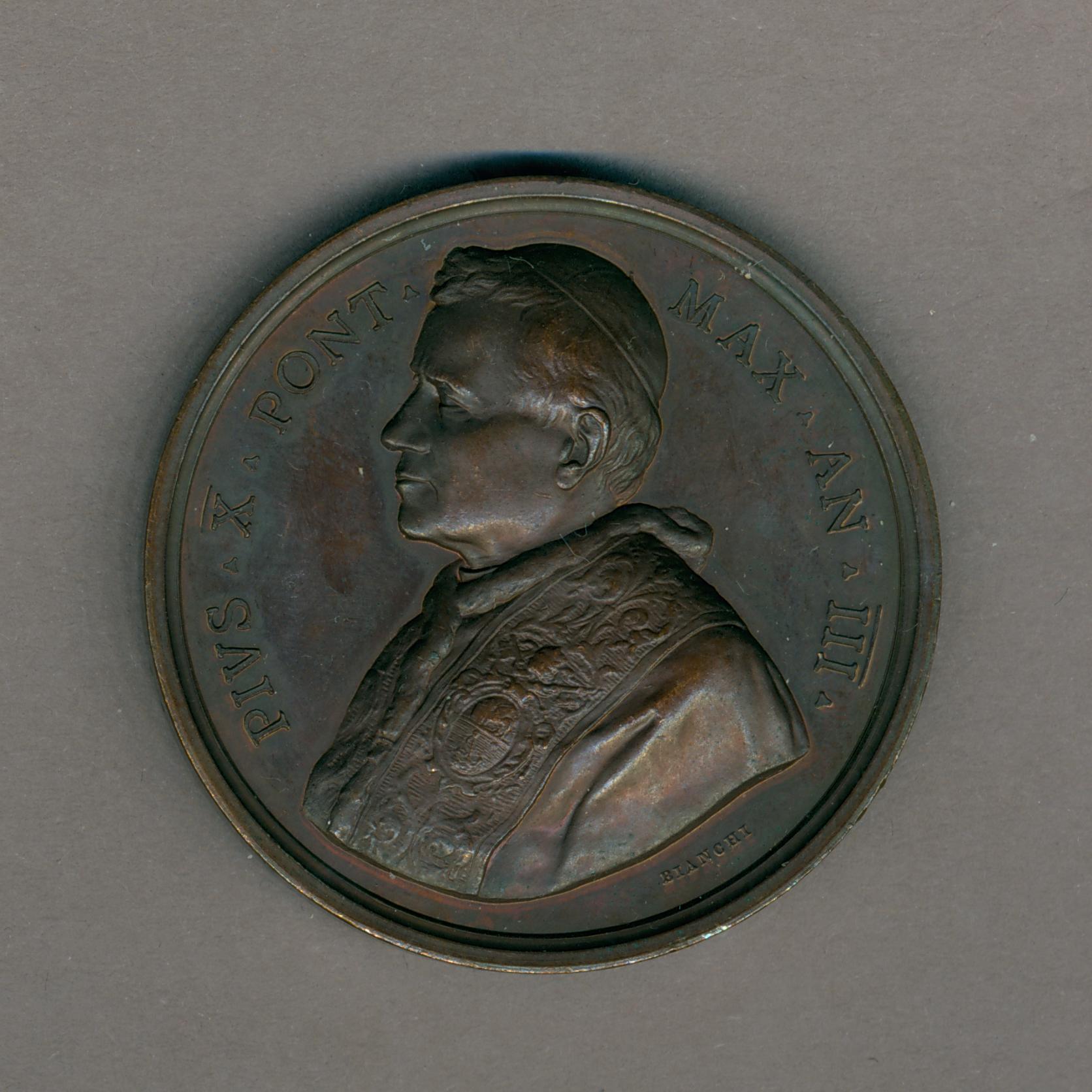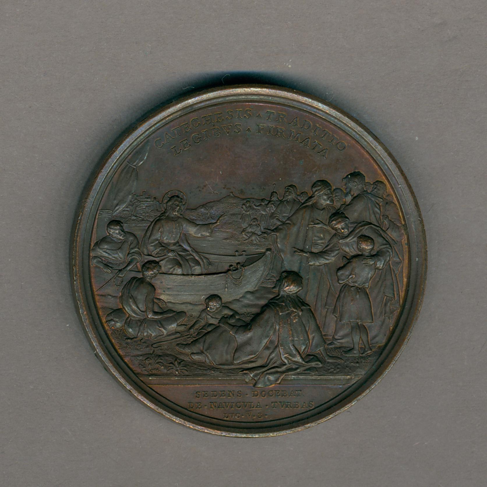 Pauspenning met portret paus Pius X (1903-1914), met "... AN III", kz. Christus in een scheepje gezeten onderwijst de omstanders