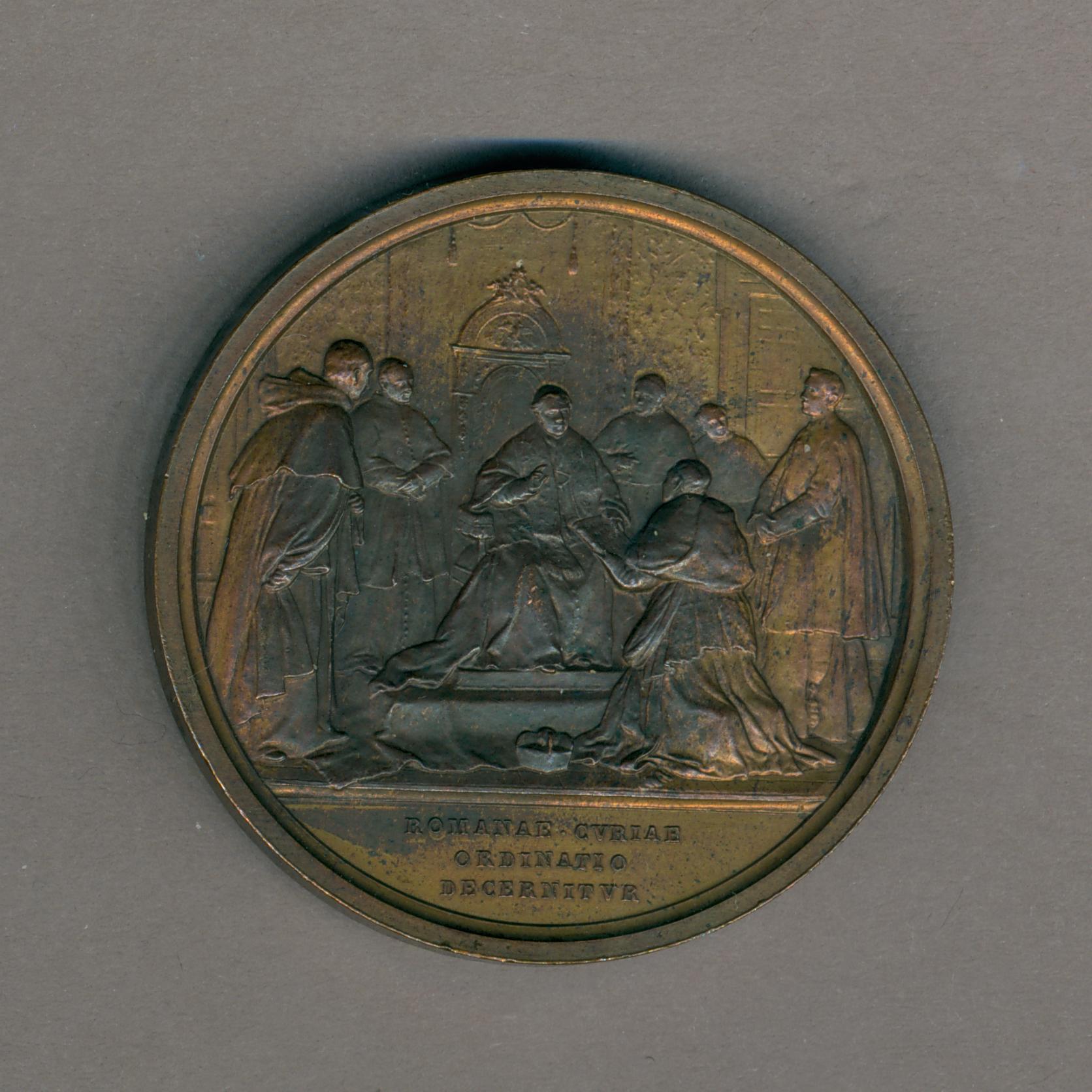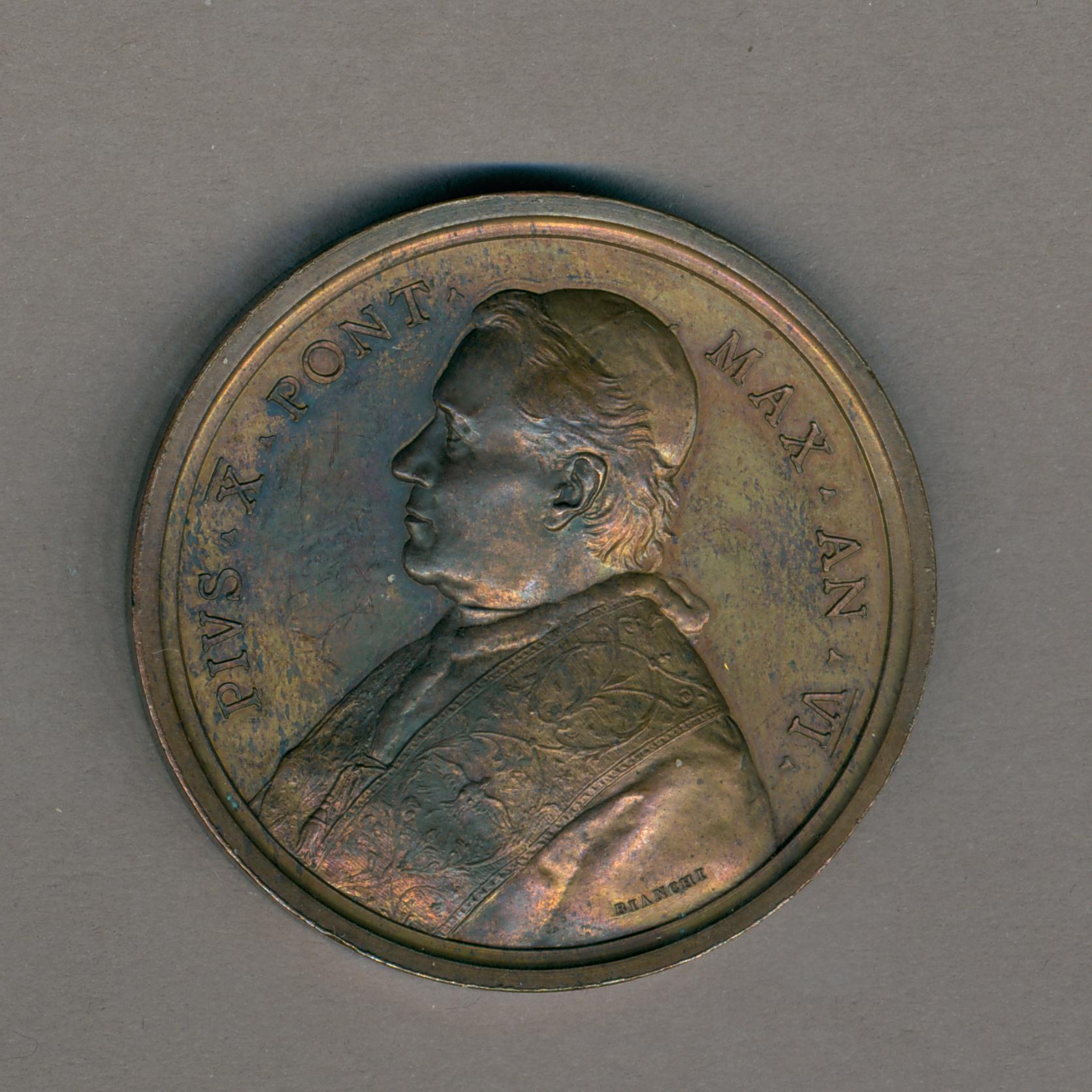 Pauspenning met portret paus Pius X (1903-1914), met "... AN VI", kz. paus gezeten op troon overhandigd boek aan een kardinaal die vóór hem knielt, geestelijken rondom