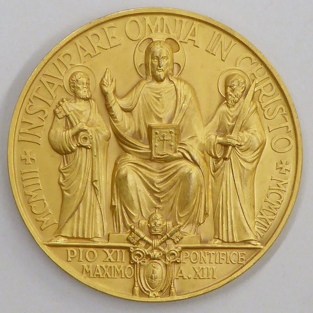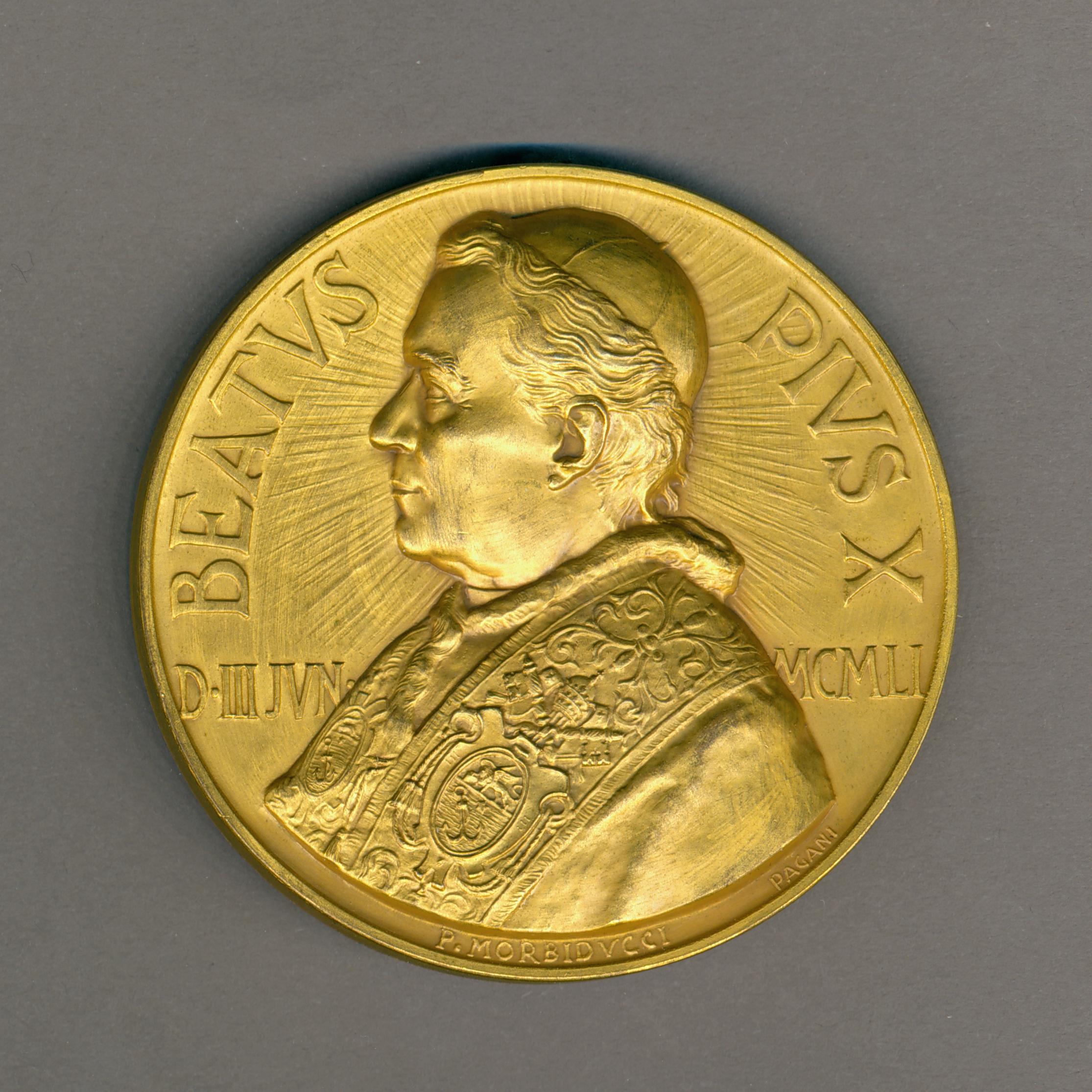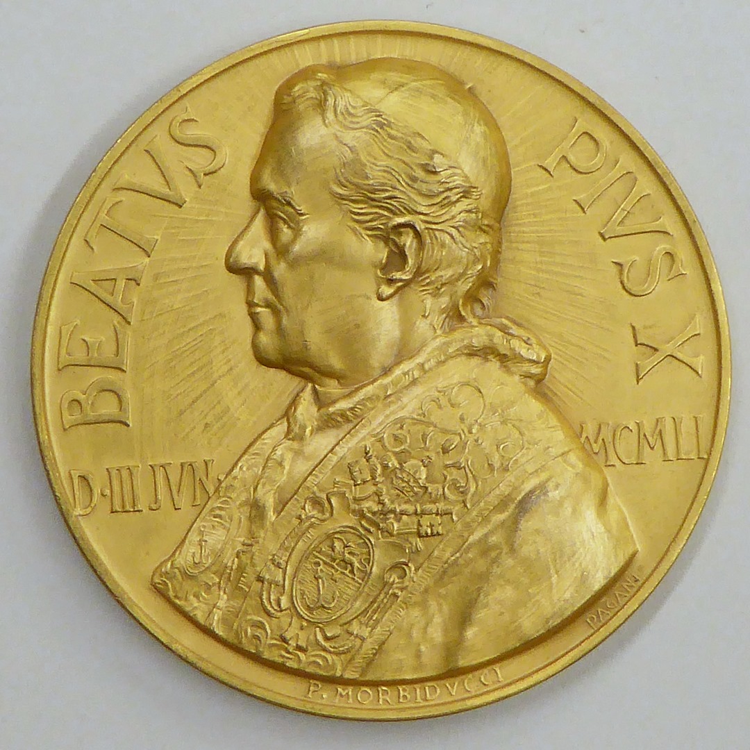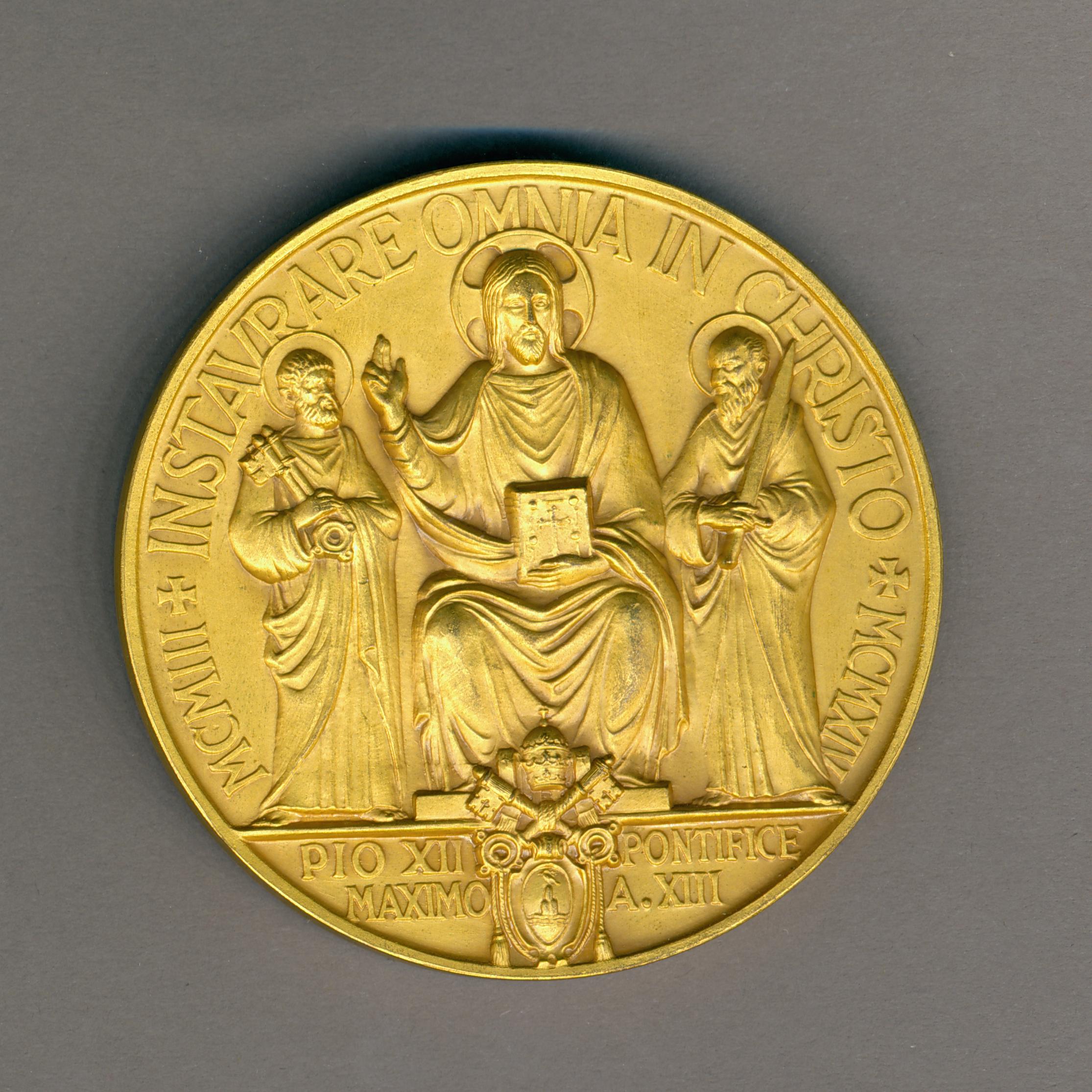 Pauspenning met portret paus Pius X (1903-1914), ter gelegenheid van zijn zaligverklaring, kz. Christus met Petrus en Paulus