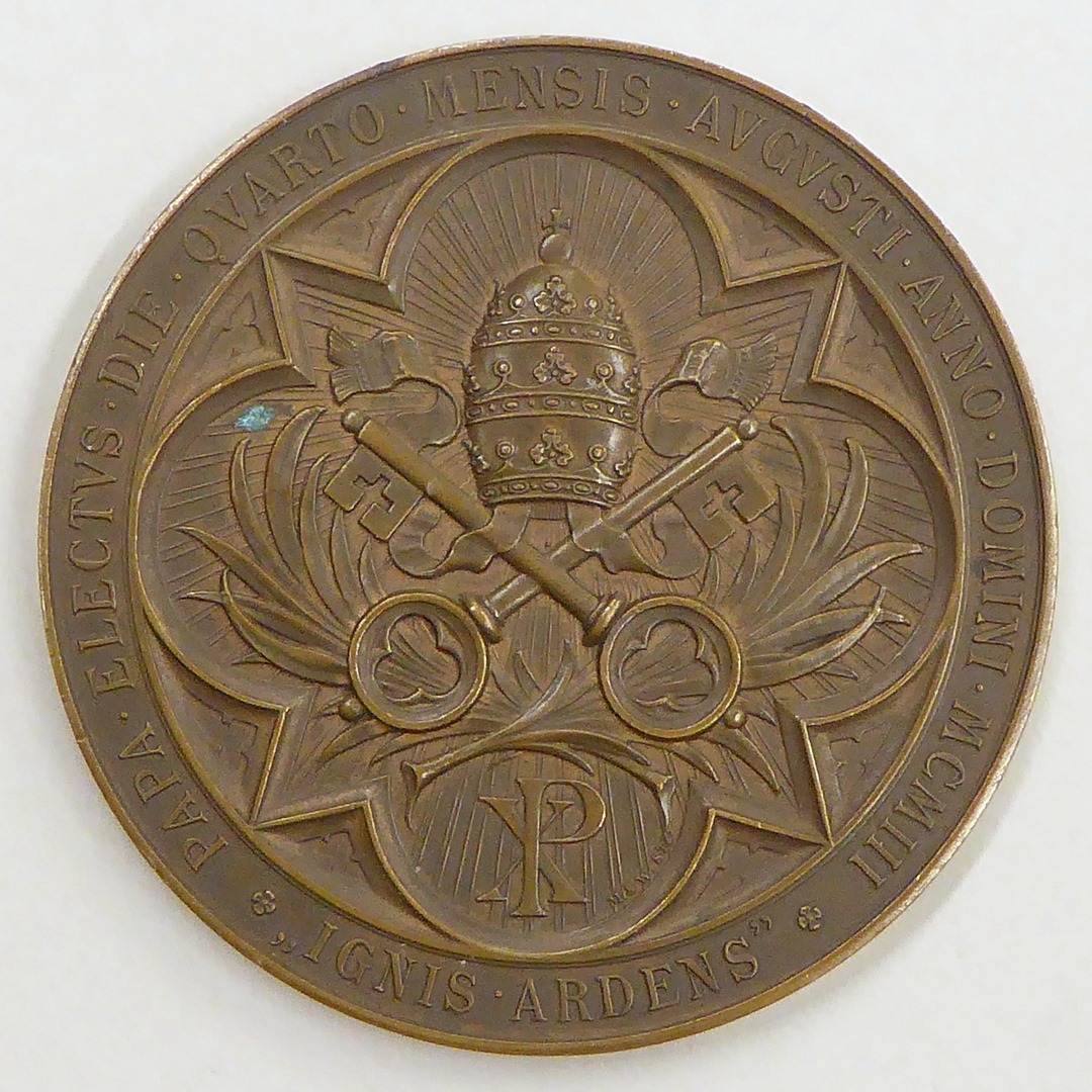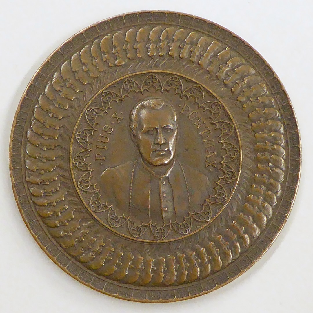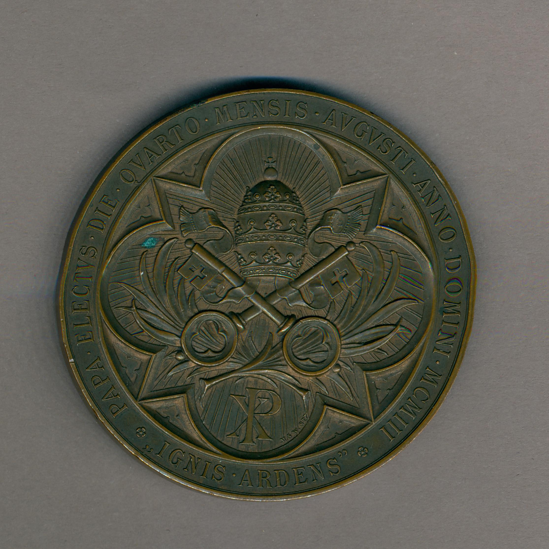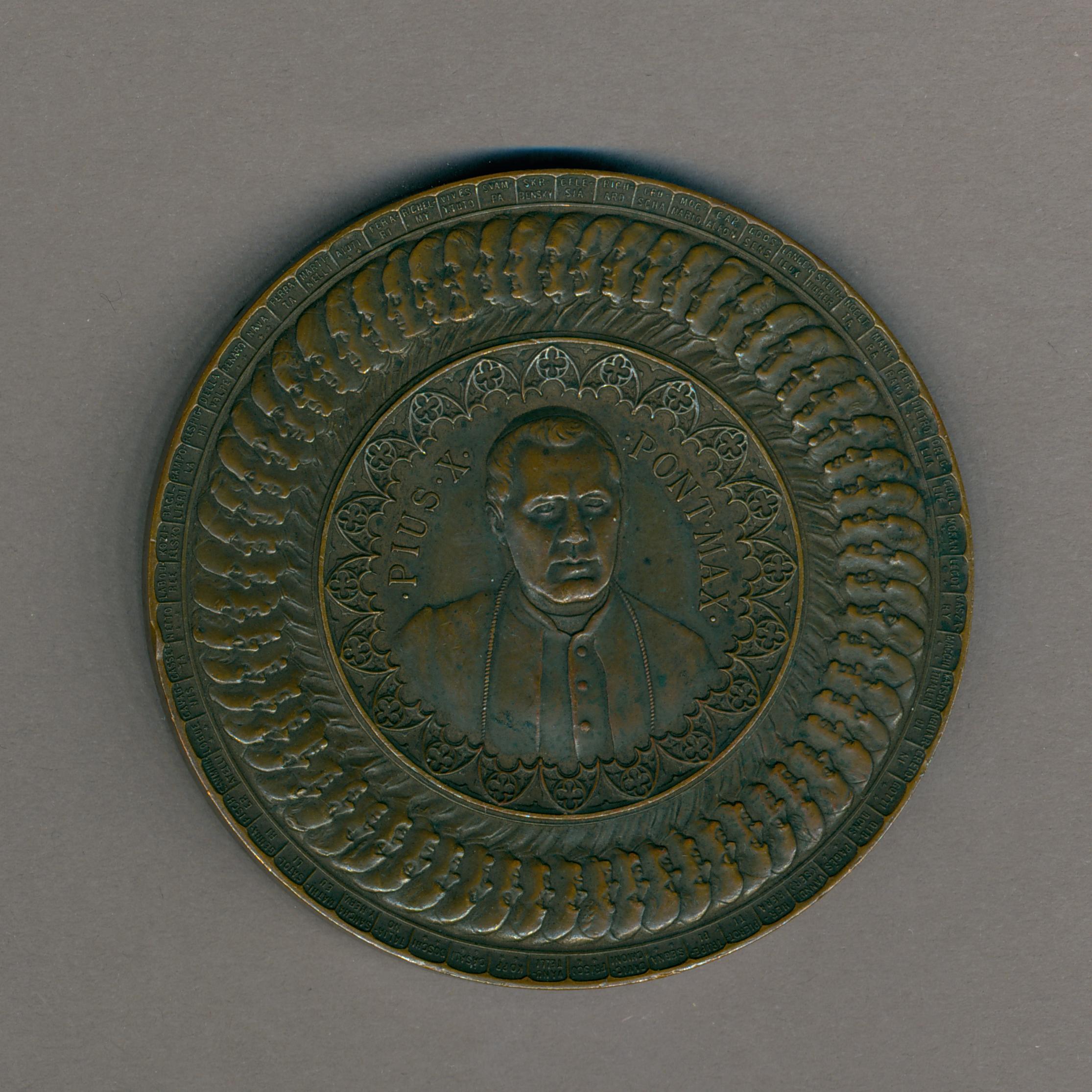 Pauspenning met portret paus Pius X (1903-1914), hieromheen portretten van kardinalen, daaromheen de namen van de kardinalen, kz. pauselijk wapen in een vierpas