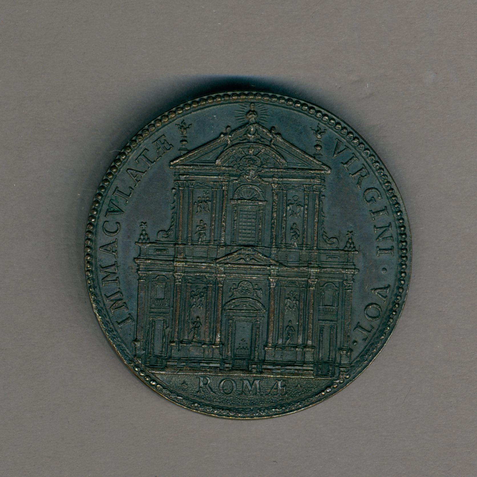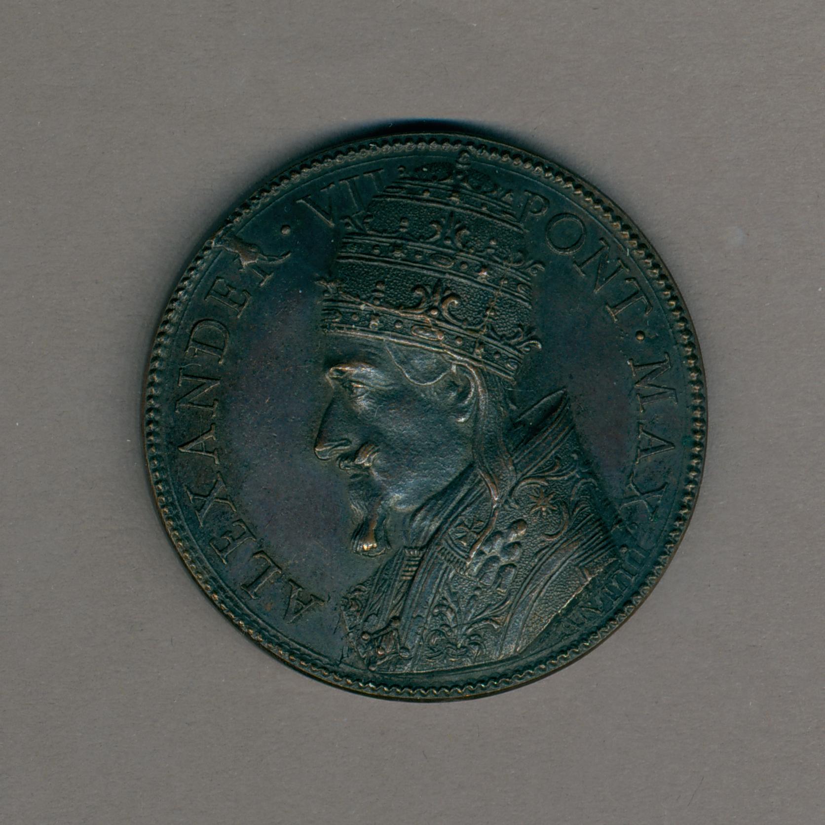 Pauspenning met portret paus Alexander VII (1655-1667), met "... AN VIII", kz. facade van Santa Maria in Campitelli te Rome
