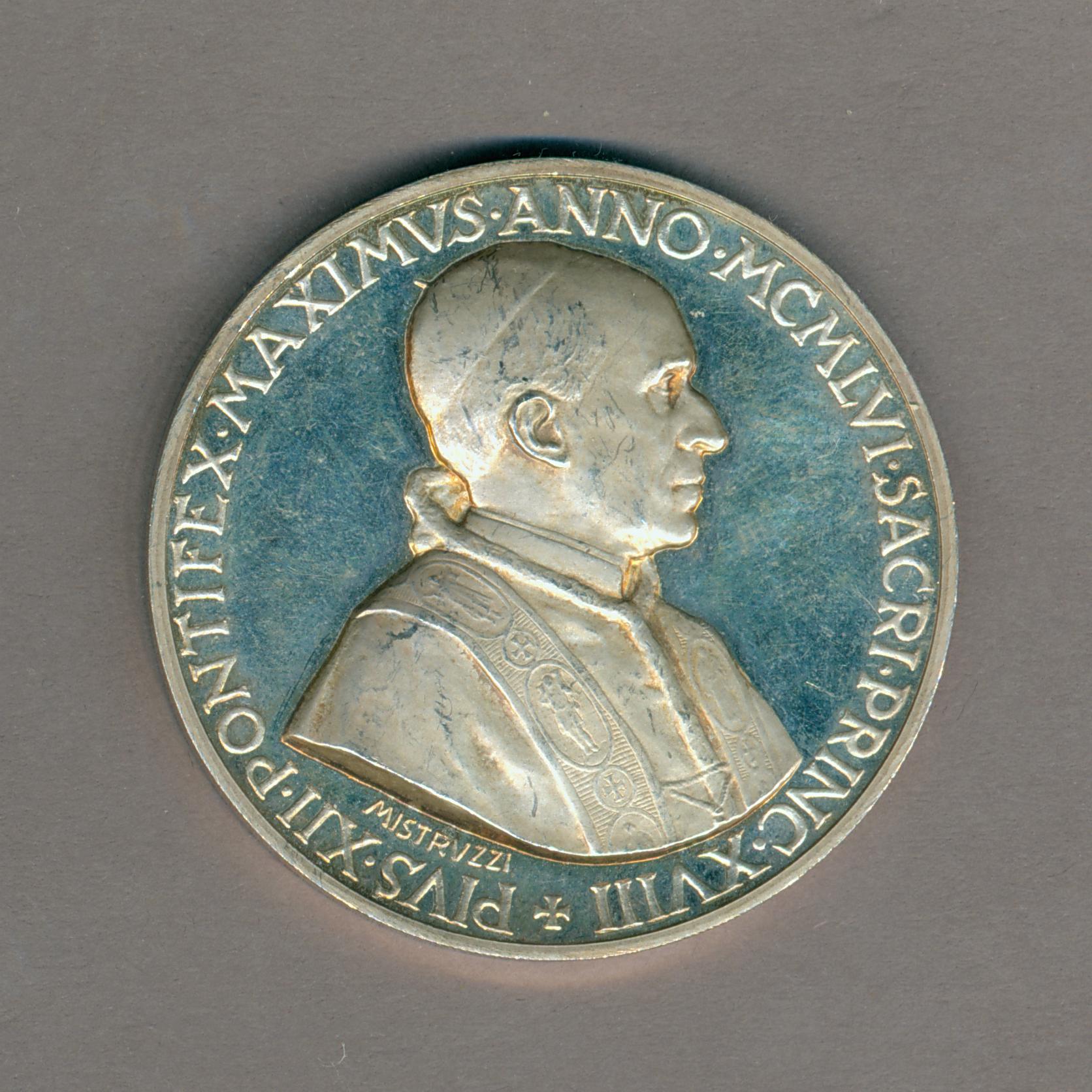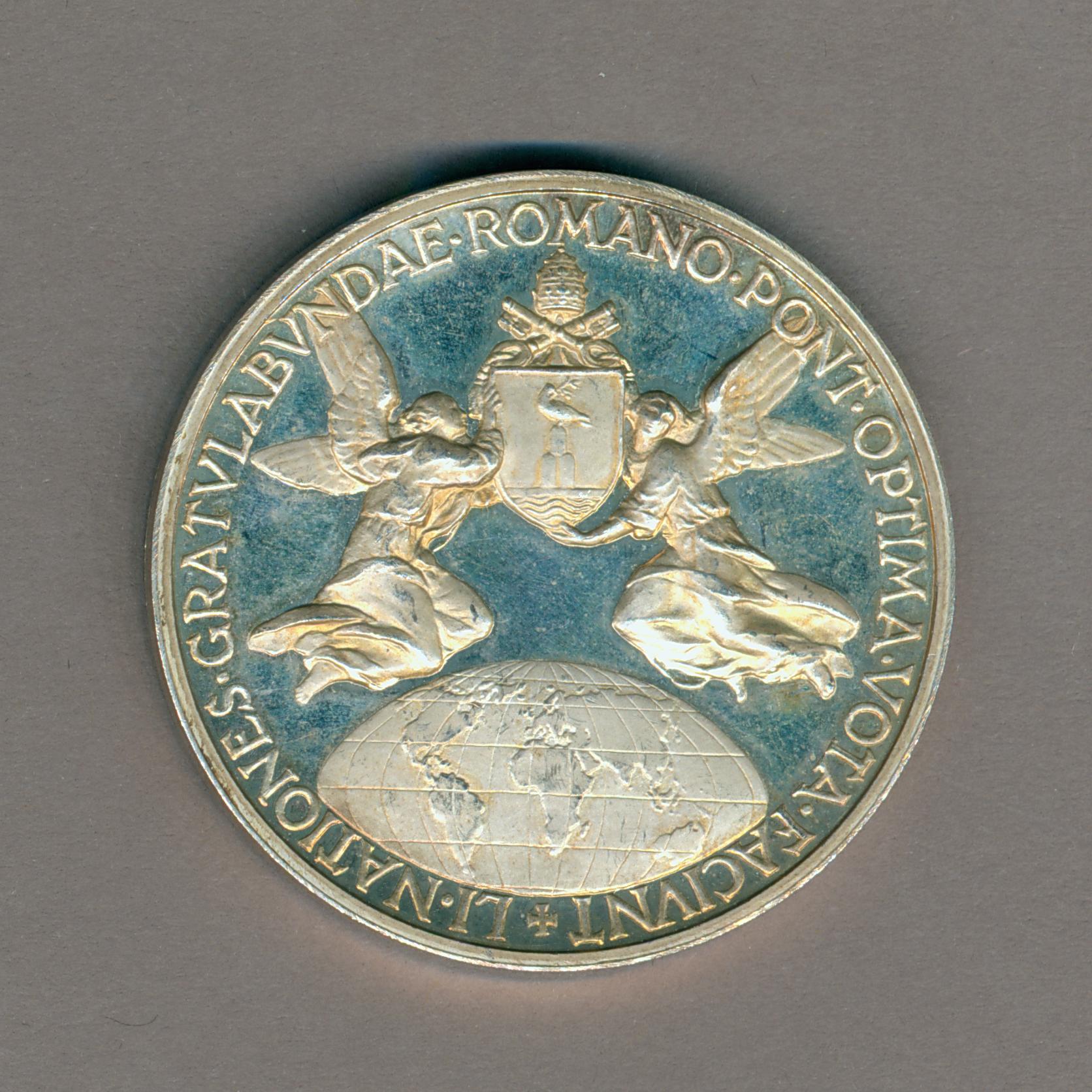 Pauspenning met portret paus Pius XII (1939-1958), kz. twee engelen tonen het pauselijk wapen, wereldbol