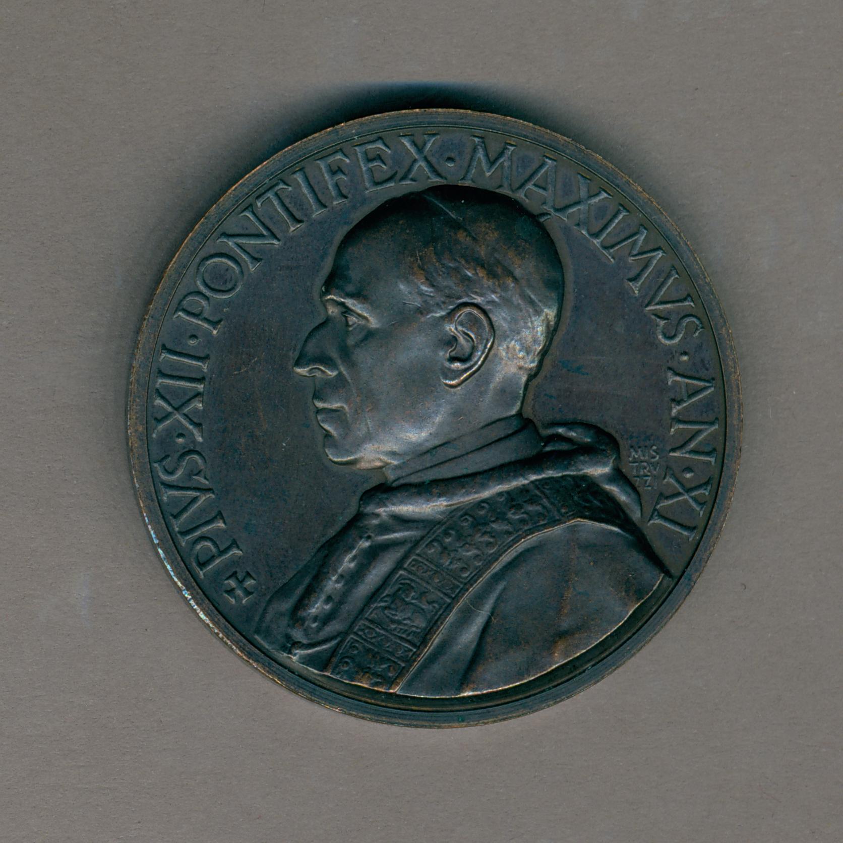Pauspenning met portret paus Pius XII (1939-1958), met "... AN XI", kz. vrouw gezeteld met kruis en evangelieboek, twee engelen met schild "veritas" en "iustitia"