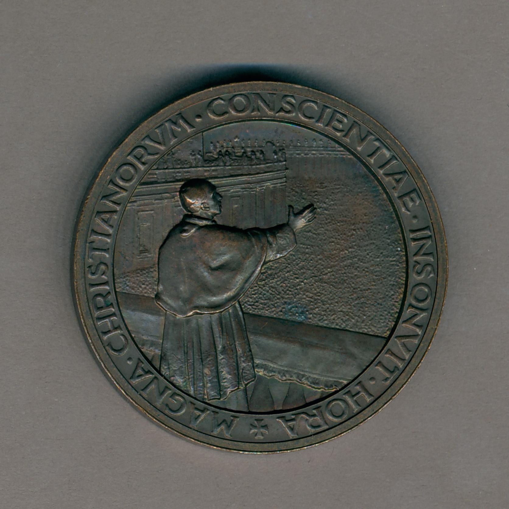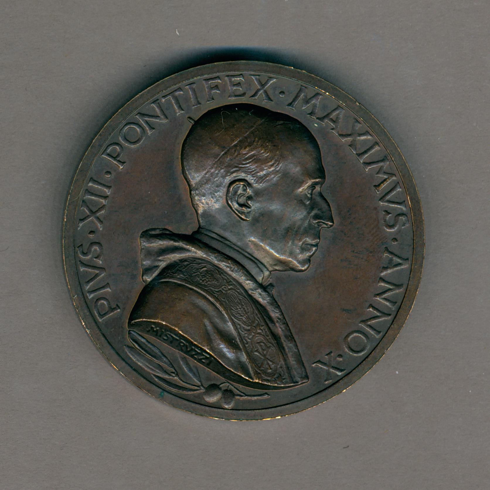 Pauspenning met portret paus Pius XII (1939-1958), met "... ANNO X", kz. kz. paus spreekt menigte toe vanaf balkon St. Pieter te Rome