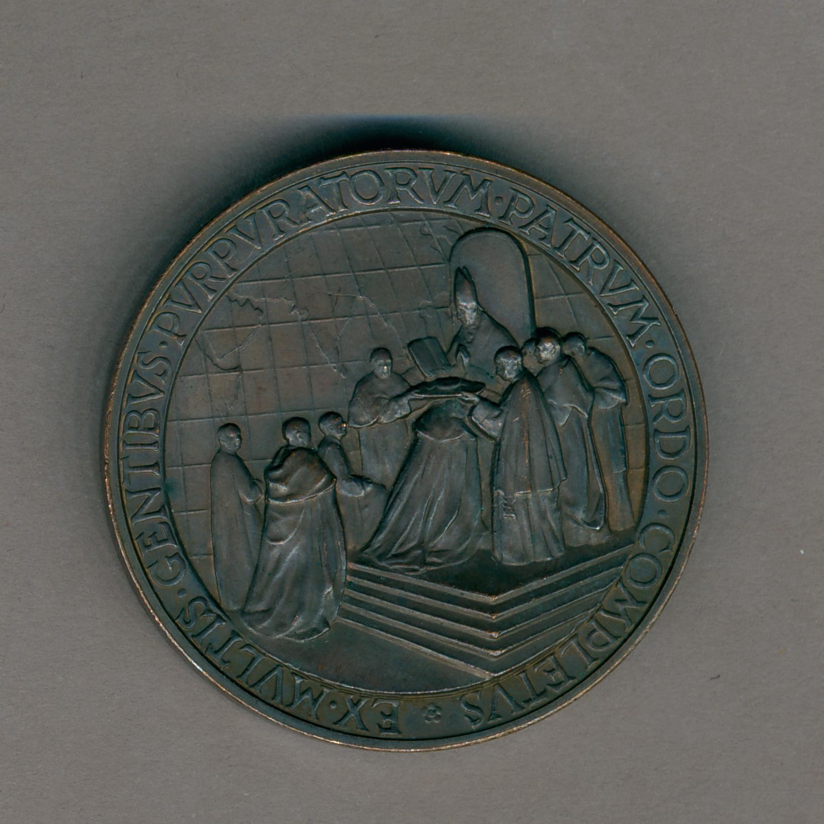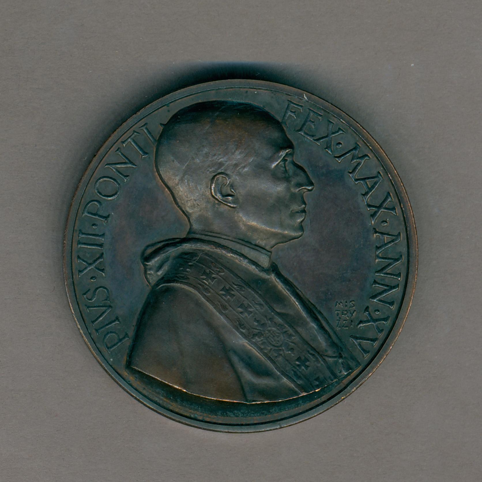 Pauspenning met portret paus Pius XII (1939-1958), met "... ANN XV", kz. paus benoemt nieuwe kardinaal, op de achtergrond een wereldkaart