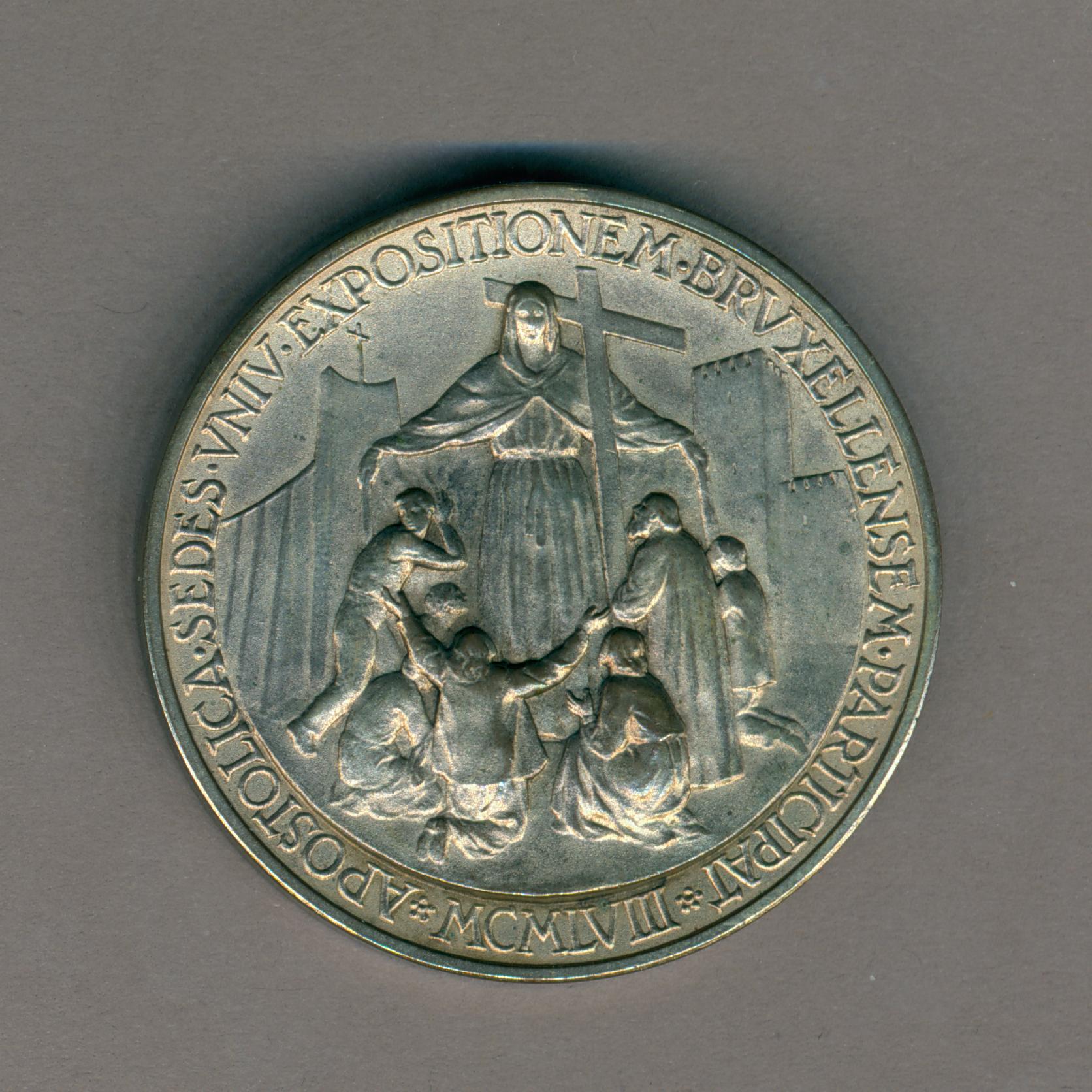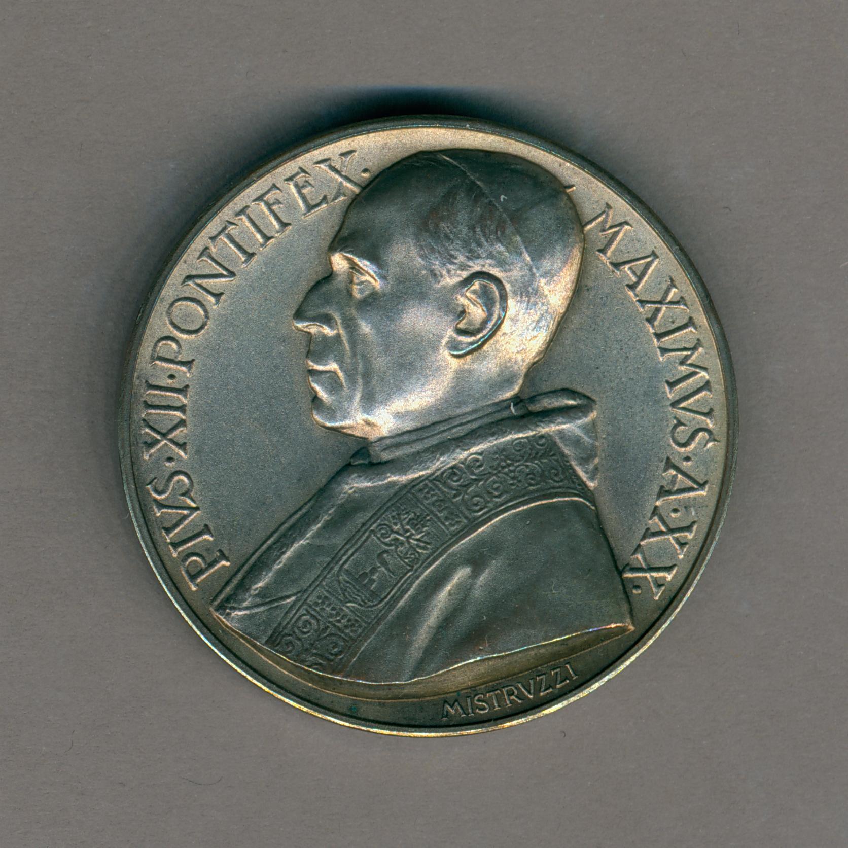 Pauspenning met portret paus Pius XII (1939-1958), met "... A XX", kz. allegorische figuur Geloof met kruis die biddende mensen onder haar mantel beschermt