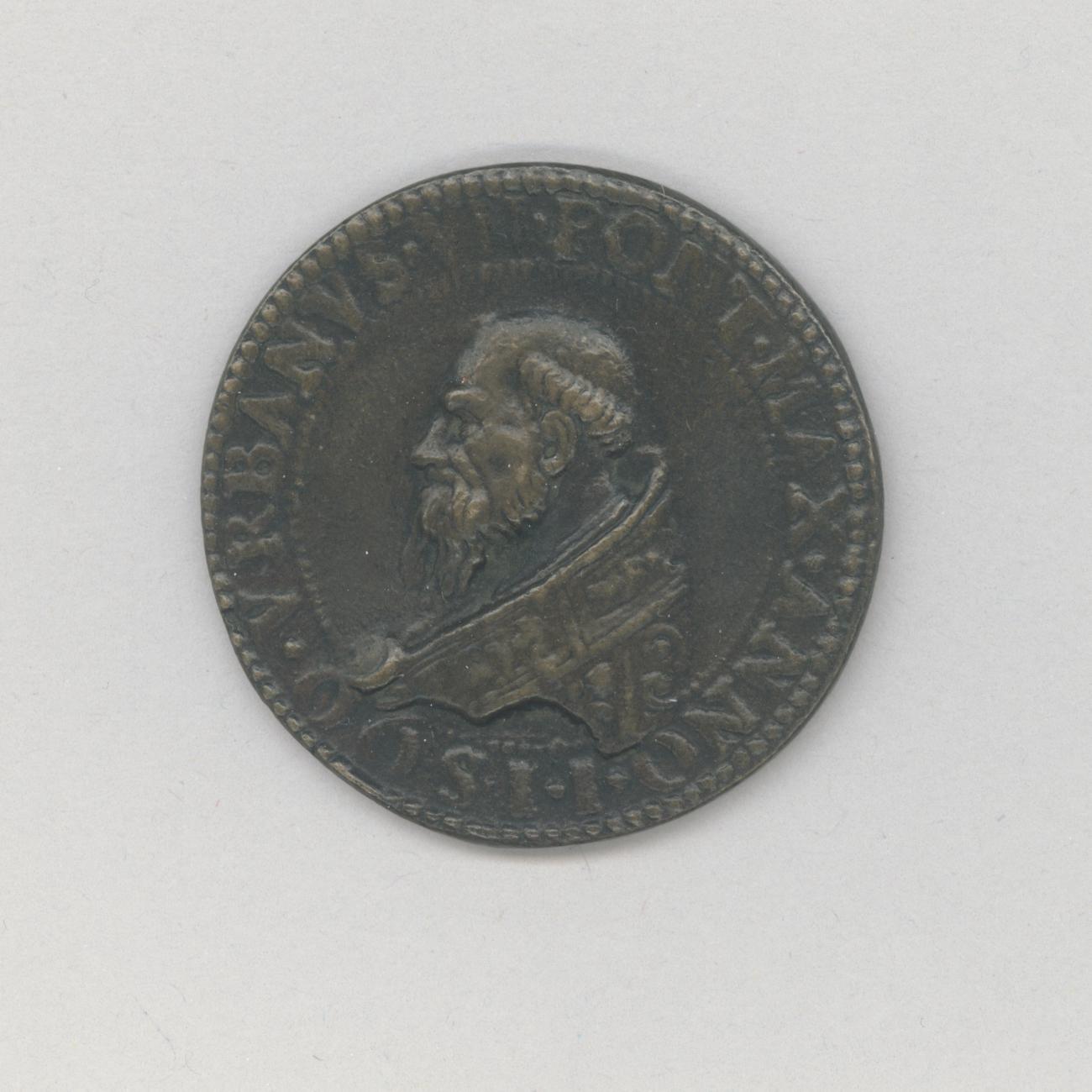 Pauspenning met portret paus Urbanus VII (1590), kz. zevenarmige kandelaar