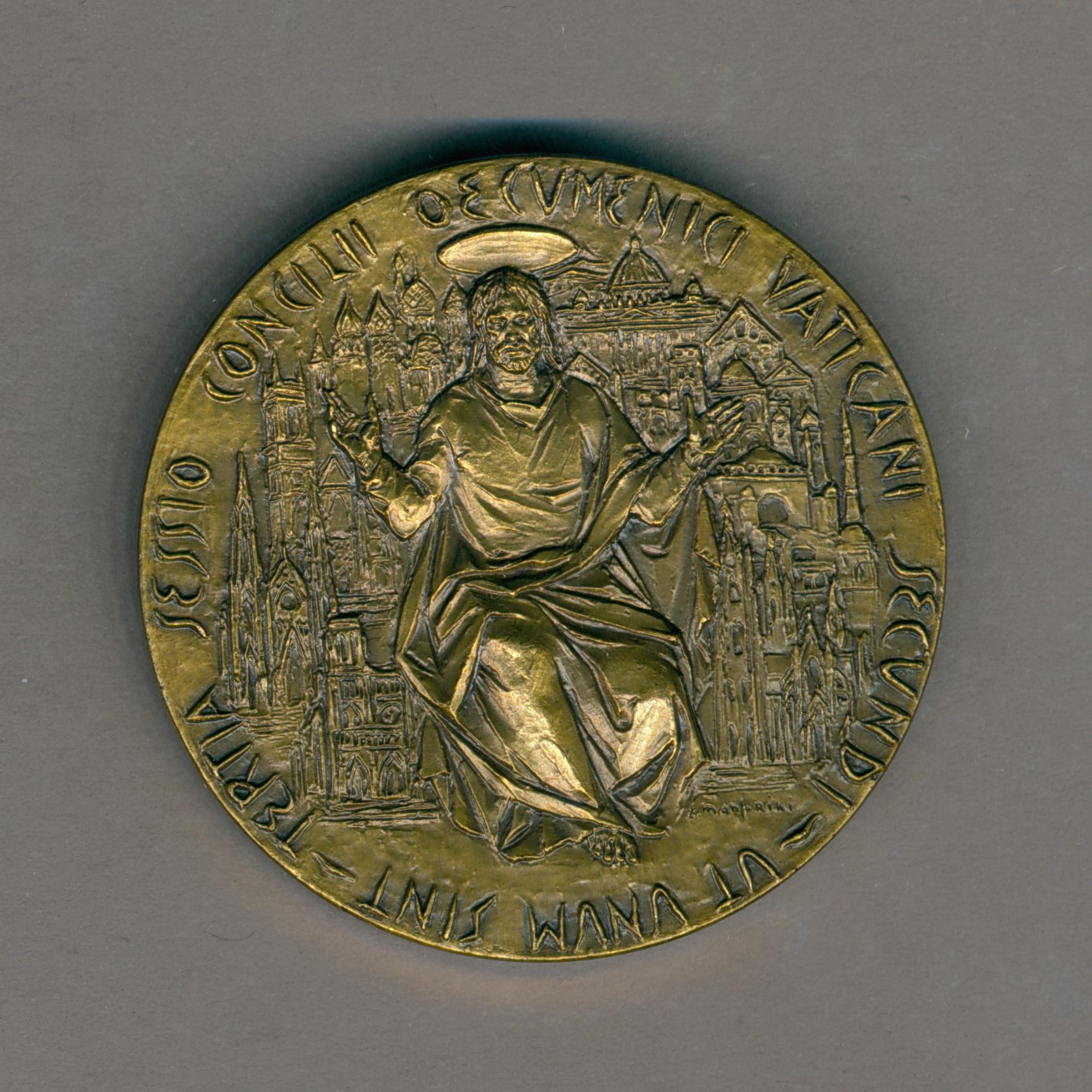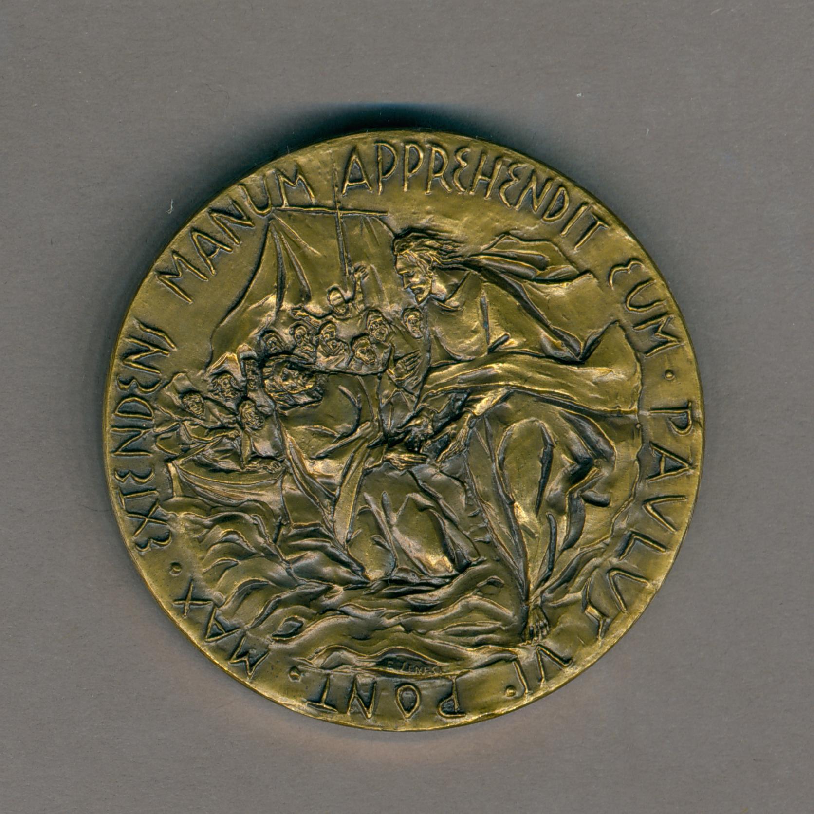 Pauspenning paus Paulus VI (1963-1978), Christus gezeten, armen geopend, achtergrond kerken wereldwijd, kz. Christus loopt op water, H. Petrus, apostelen