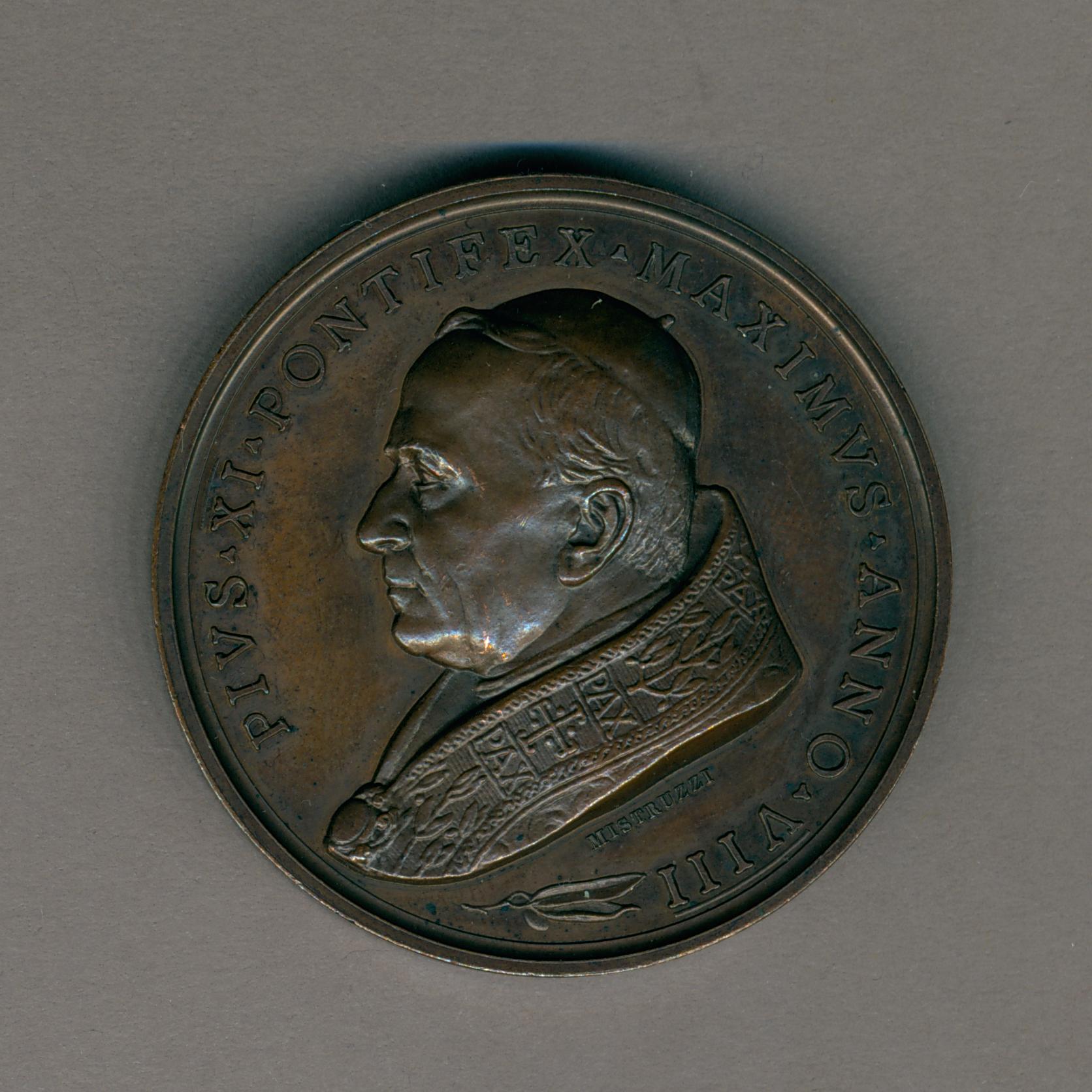 Pauspenning met portret paus Pius XI (1922-1939), met "... ANNO VIII", kz. kelk met brandende hosti, vooraanzicht Sint-Jan van Lateranen, vooraanzicht St. Pieterbasiliek