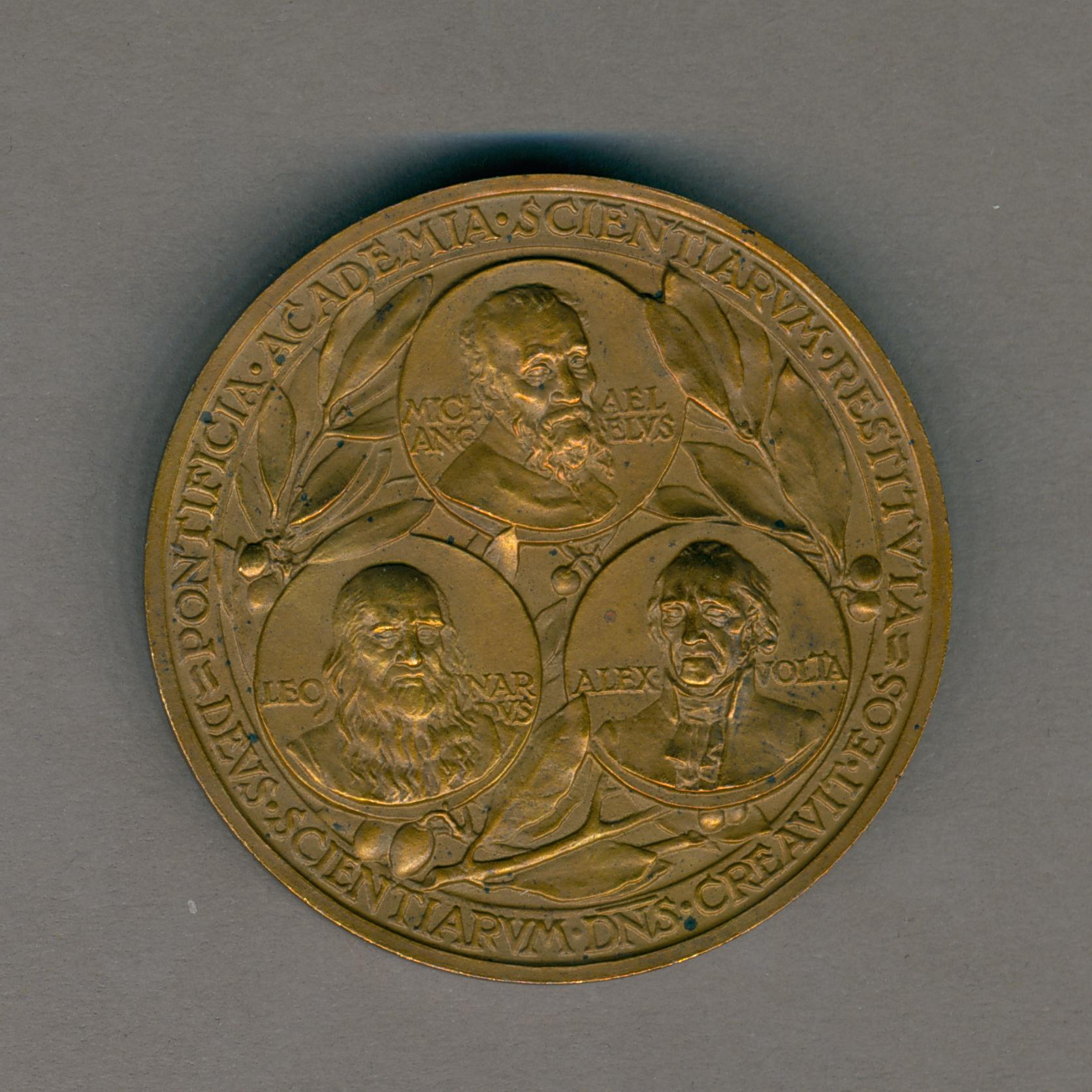 Pauspenning met portret paus Pius XI (1922-1939), met "... ANNO XVI", kz. drie bustes, Michelangelo, Leonardo en Alessandro Volta, olijftakken