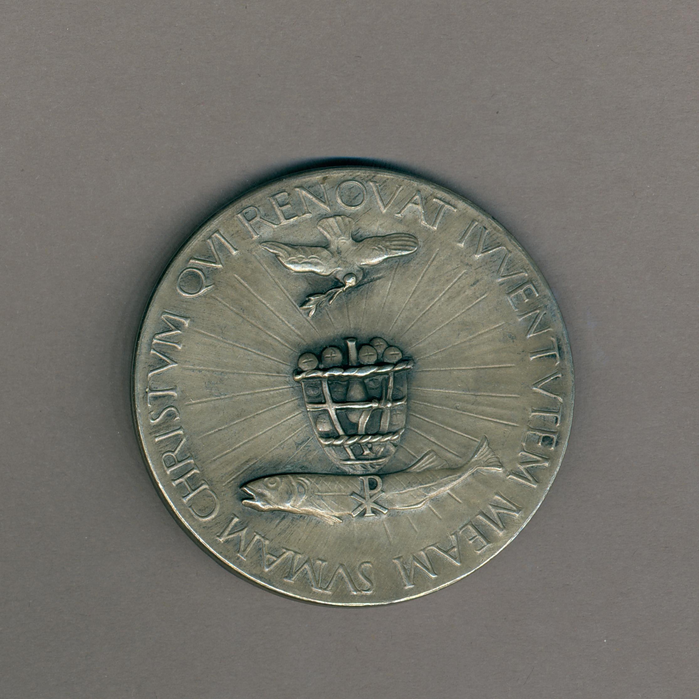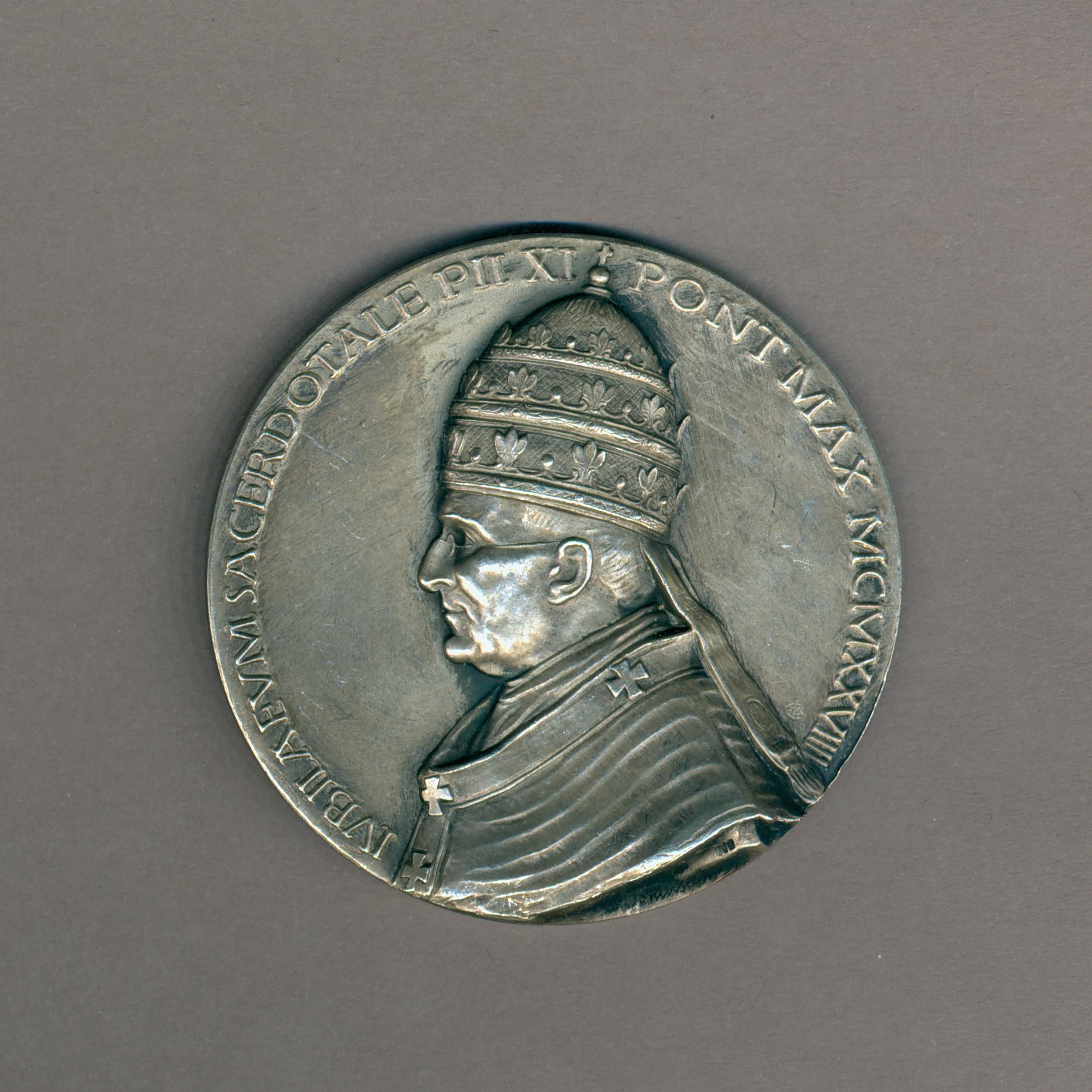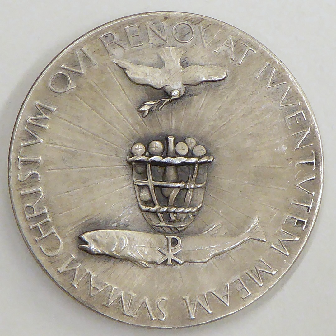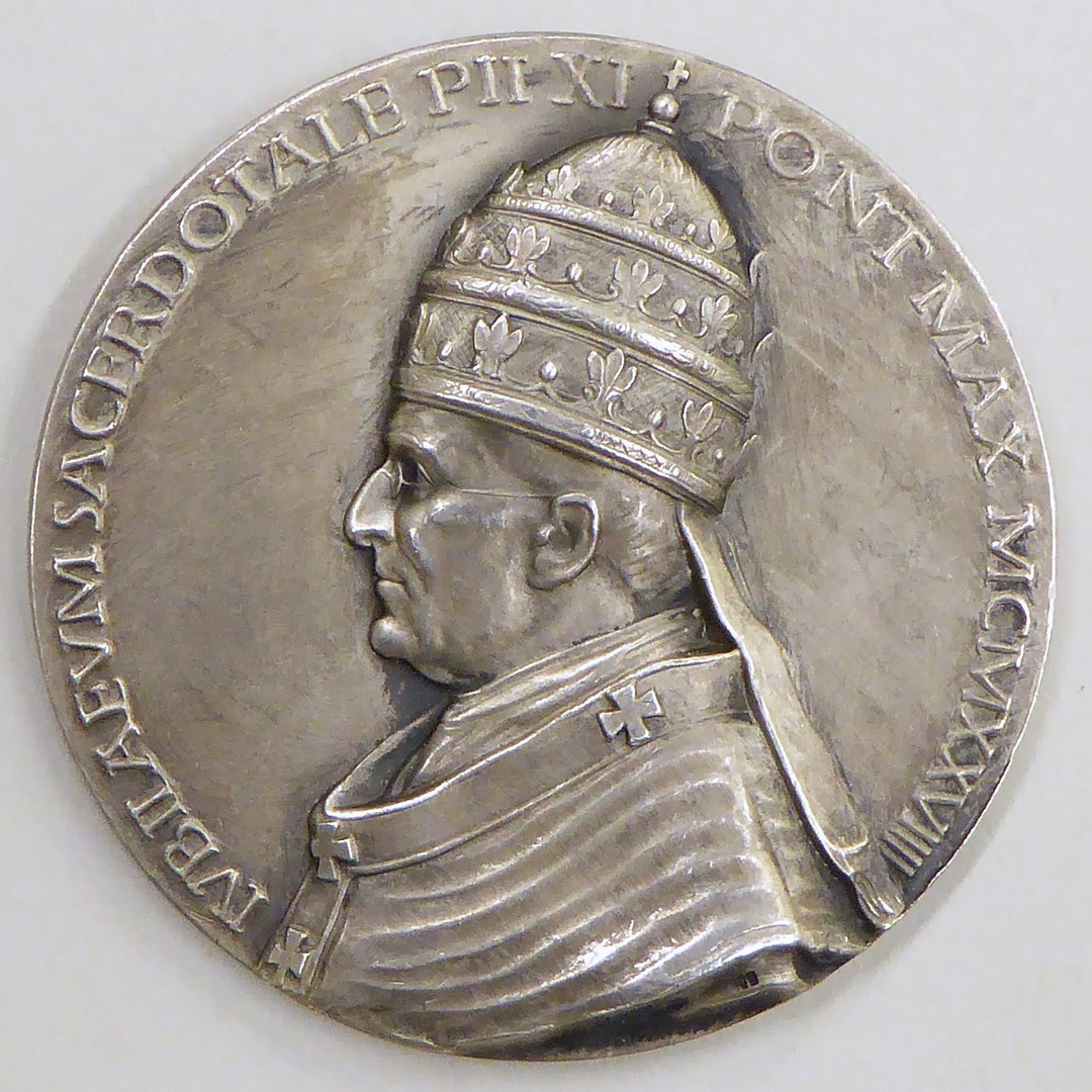 Pauspenning met portret paus Pius XI (1922-1939), kz. duif, mand met broden, vis
