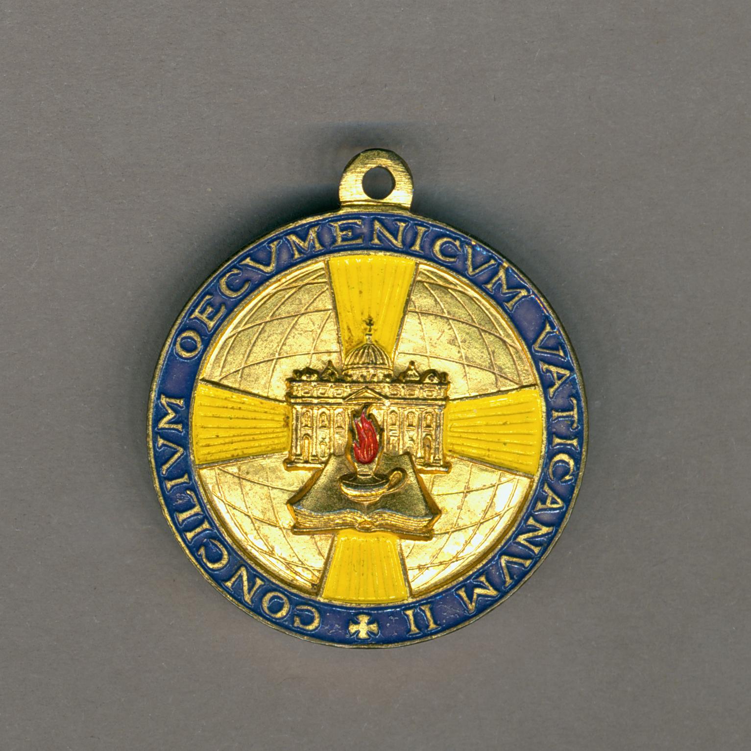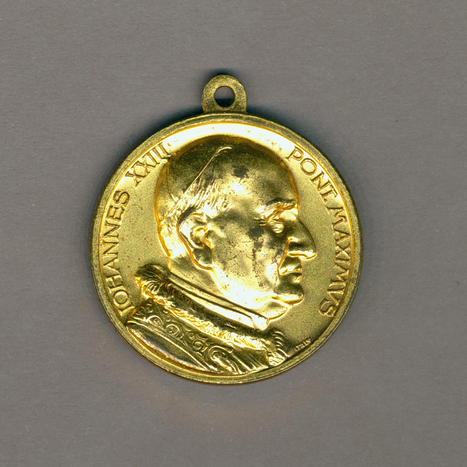 Draagpenning met portret paus Johannes XXIII (1958-1963), kz. Grieks kruis op wereldbol, in het hart de St. Pieter waarvoor open boek en olielamp
