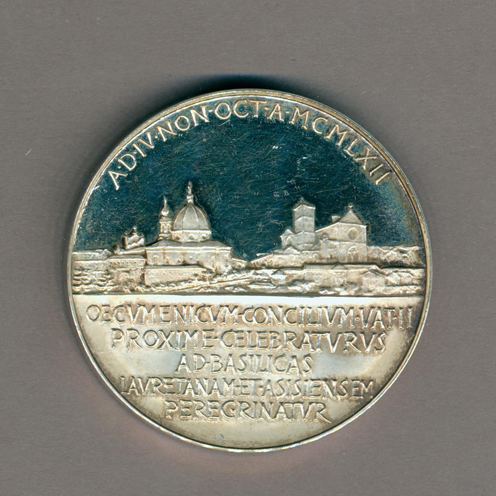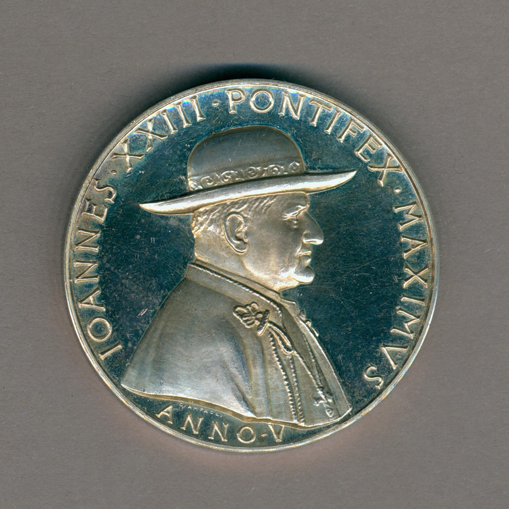 Pauspenning met portret paus Johannes XXIII (1958-1963), met "... ANNO V", kz. basilieken van Loreto en Assisi, tekst