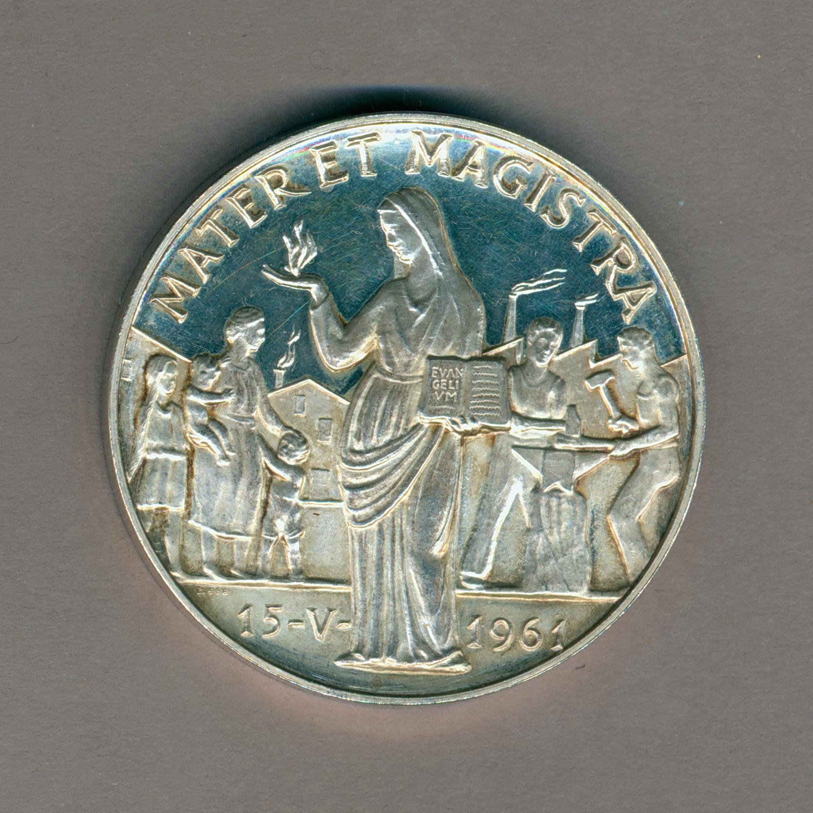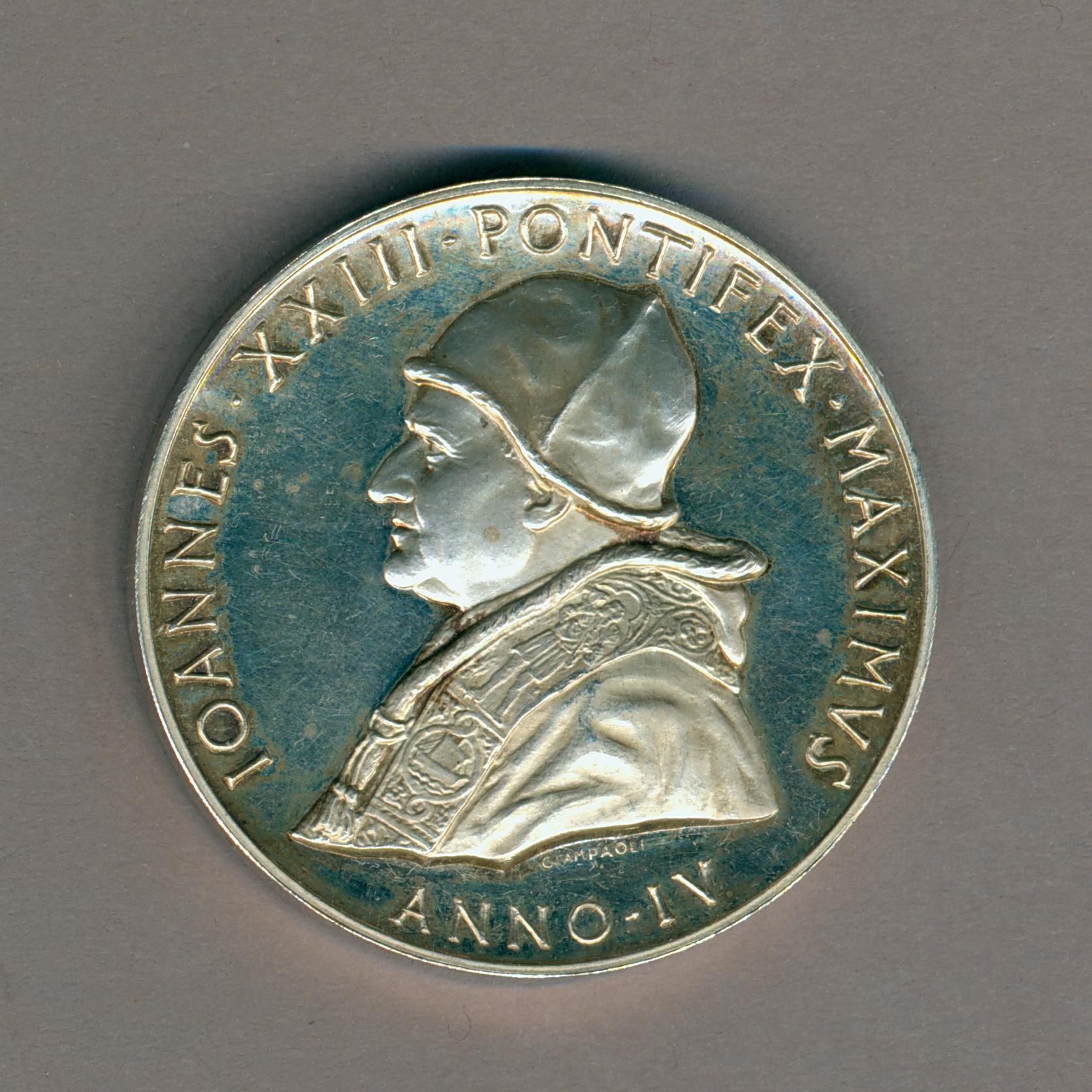 Pauspenning met portret paus Johannes XXIII (1958-1963), met "... ANNO IV", kz. allegorische figuur kerk, arbeiders, gezin