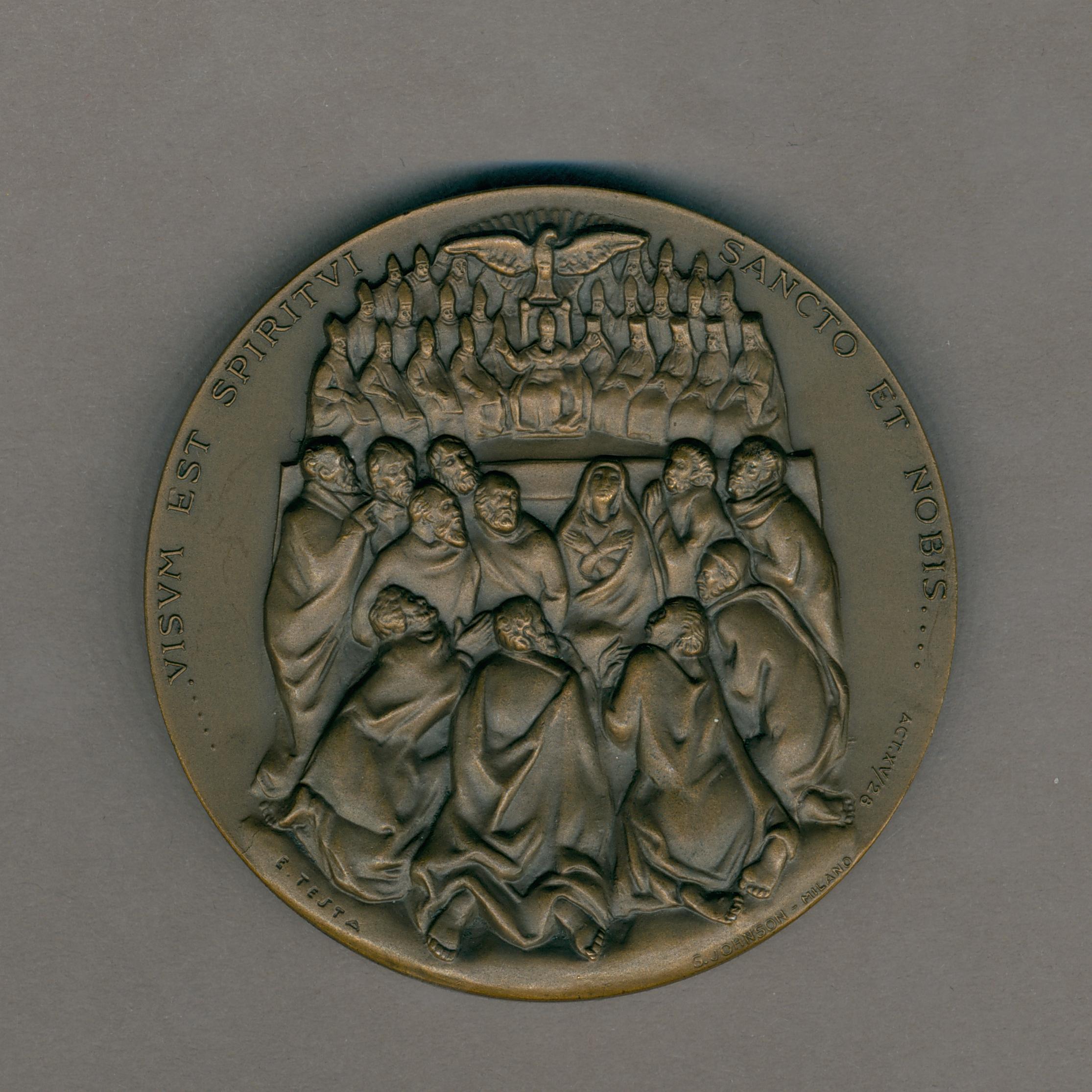 Pauspenning t.g.v. Tweede Vaticaans Oecumenisch Concilie met portret paus Johannes XXIII (1958-1963), kz. apostelen, paus met kardinalen, duif