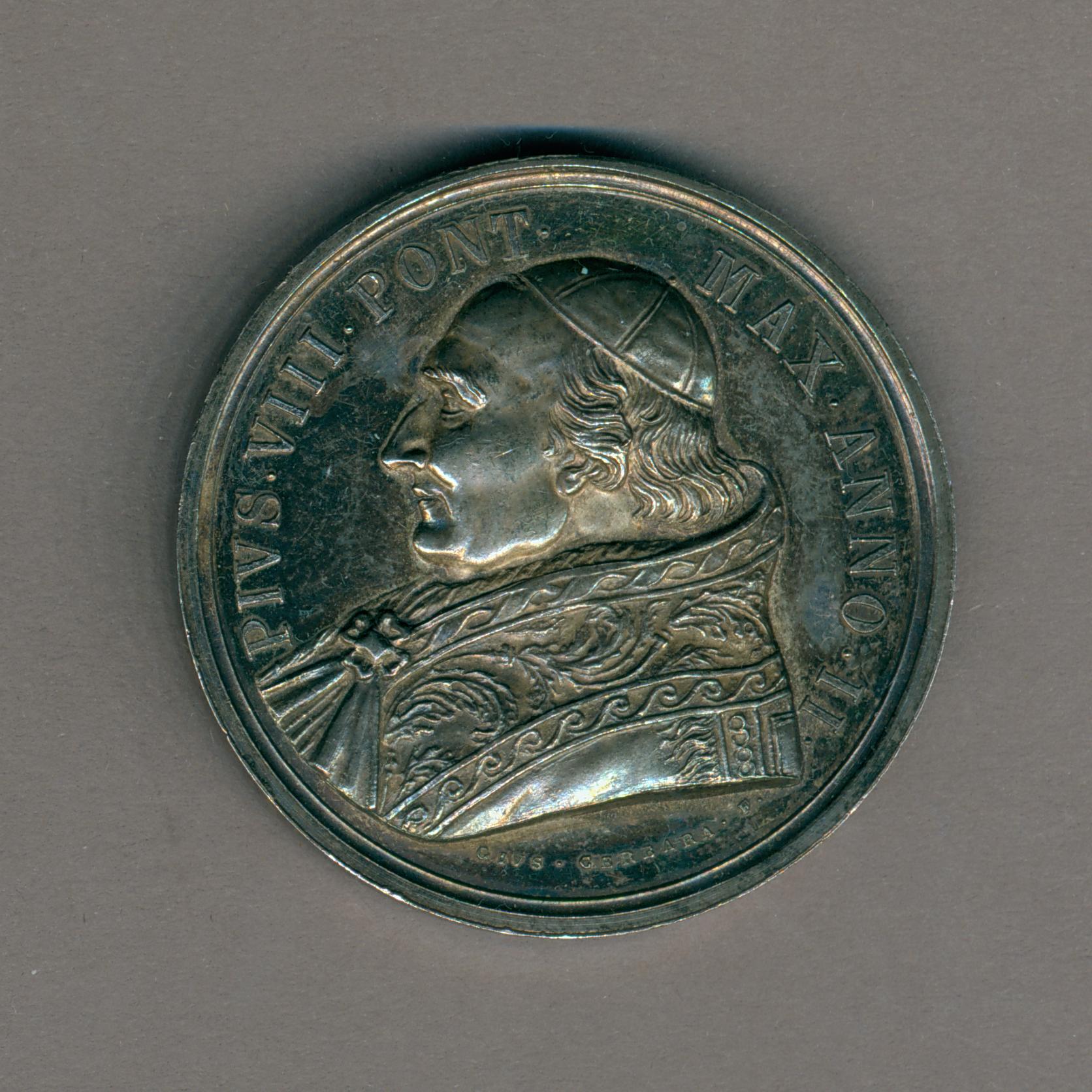 Pauspenning met portret paus Pius VIII (1829-1830), kz. Justitia, engel met palmtak, engel met tiara en sleutels