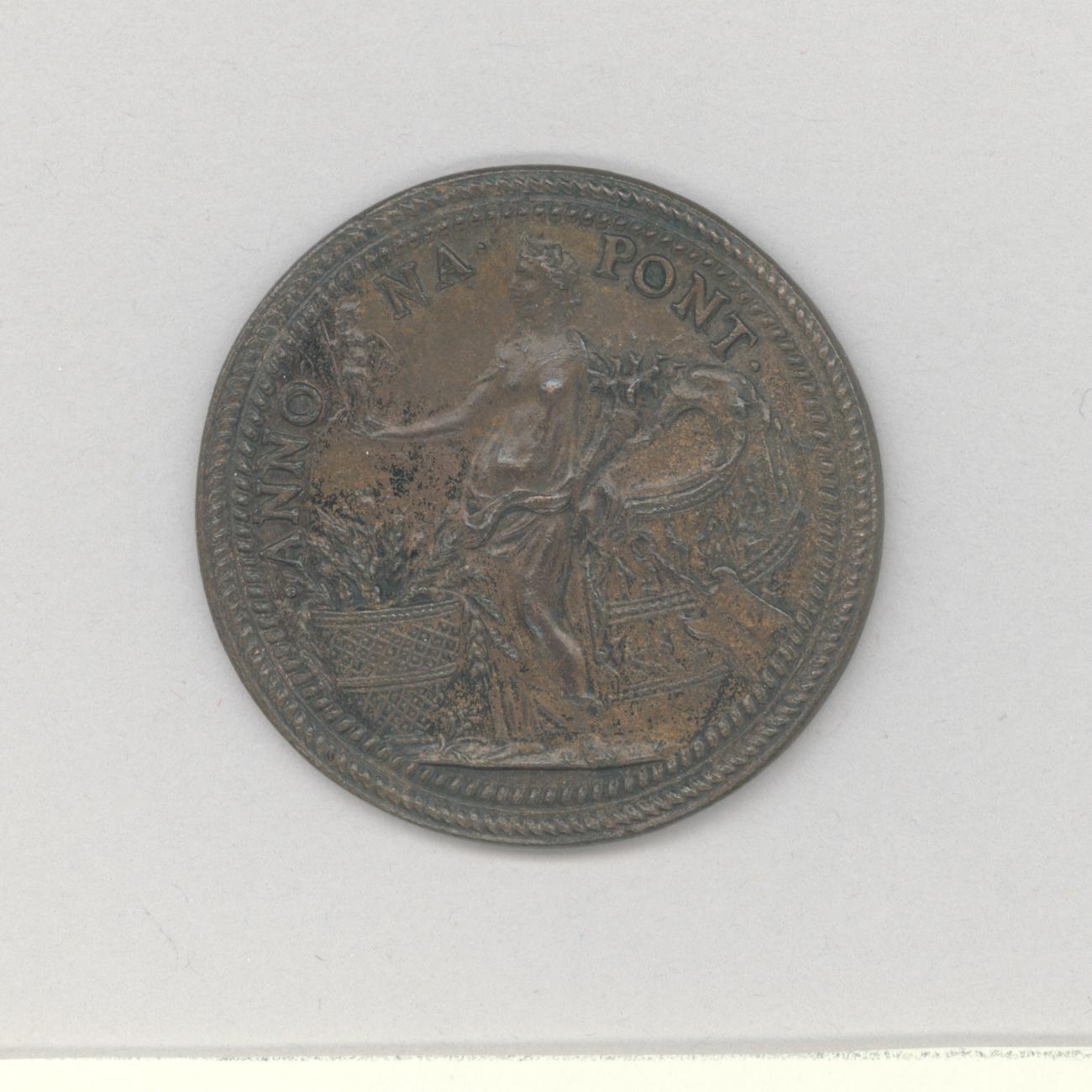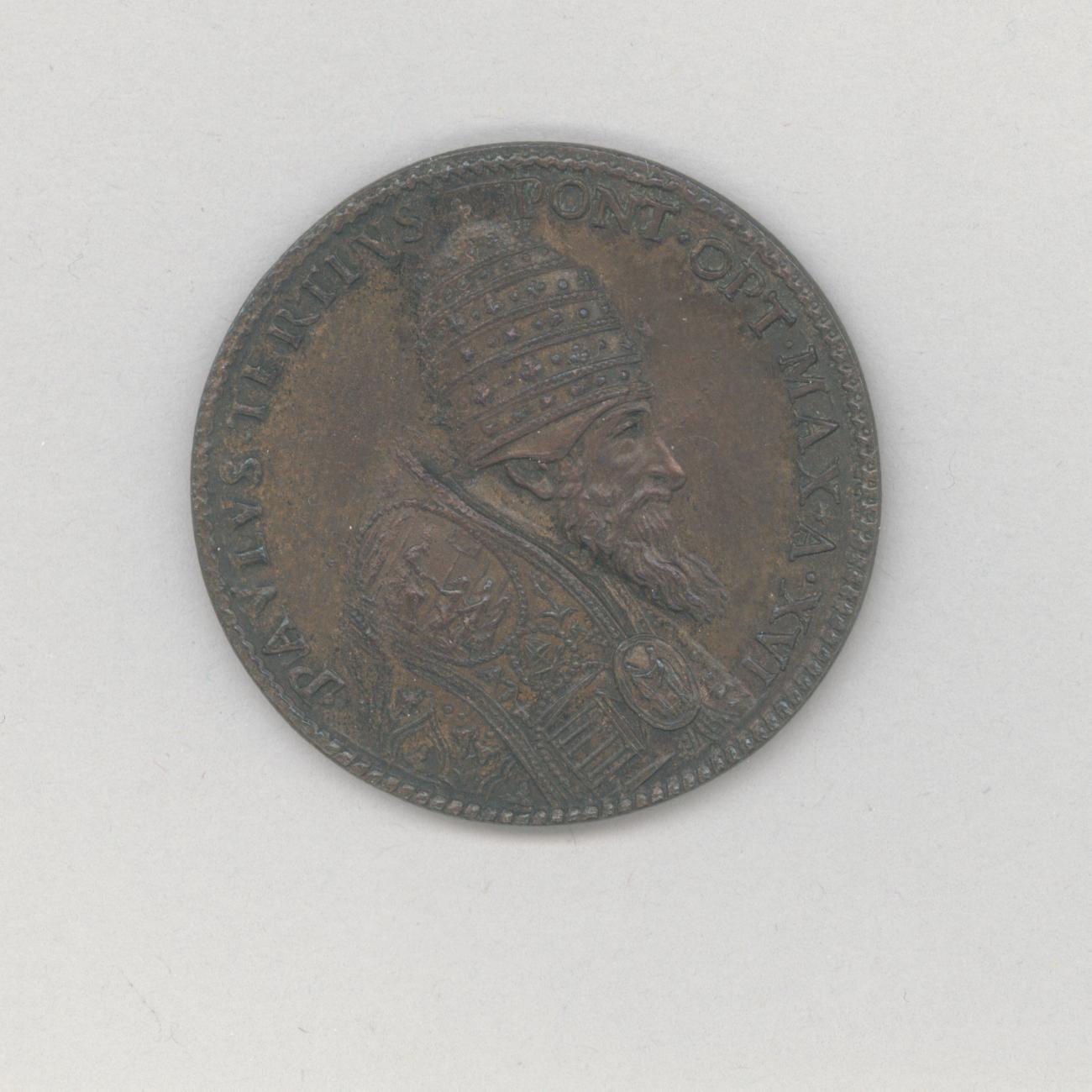 Pauspenning met portret paus Paulus III (1534-1549), met "... A XVI", kz. vrouw als personificatie van Overvloed met op haar rechterhand een jager en in haar linkerhand de hoorn des overvloeds, met mand met graan en scheepsromp met peddel voorstellende pauselijke graantoevoer
