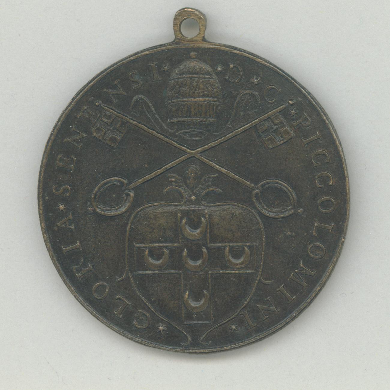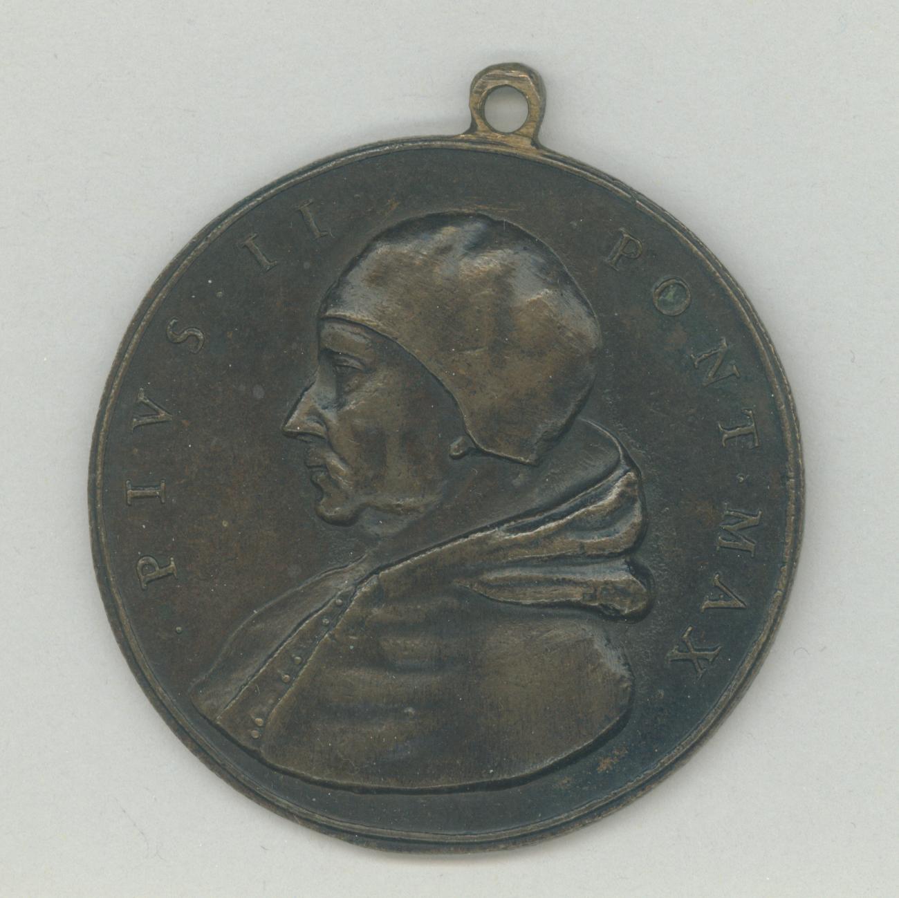 Pauspenning met portret paus Pius II (1458-1464), kz. wapen van het geslacht Piccolomini